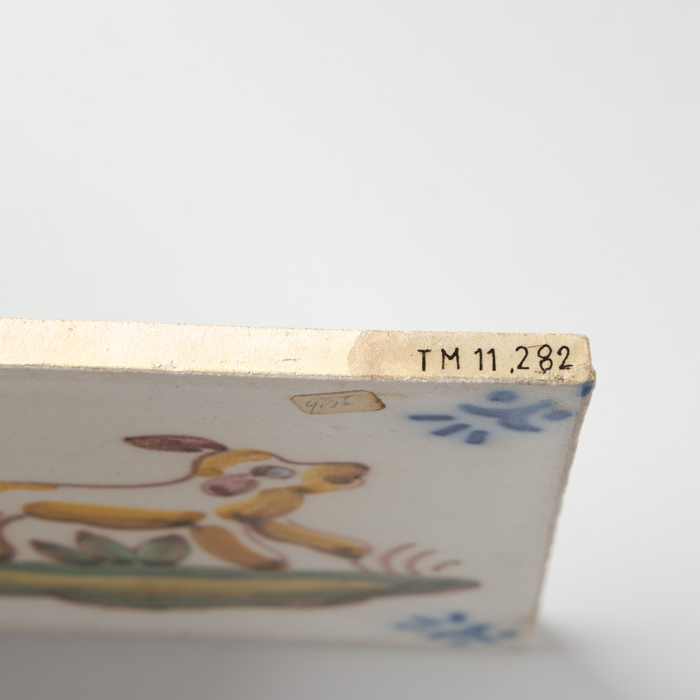Tegel van keramiek met tinglazuur, voorstellende: ho...