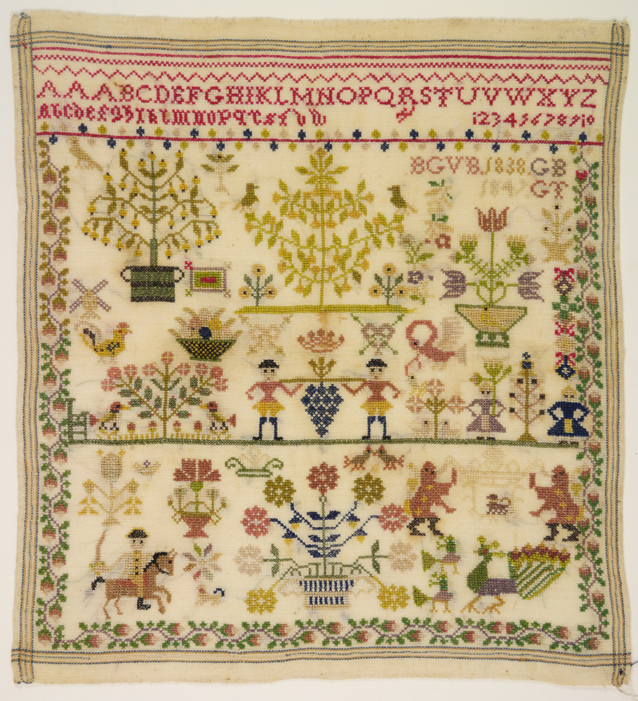 Merklap 1847 met o.a. alfabet, cijfers, dragers van ...
