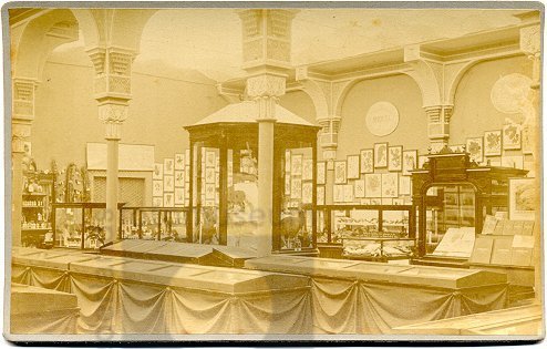 Interieur met vitrines en gebruiksvoorwerpen op kolo...