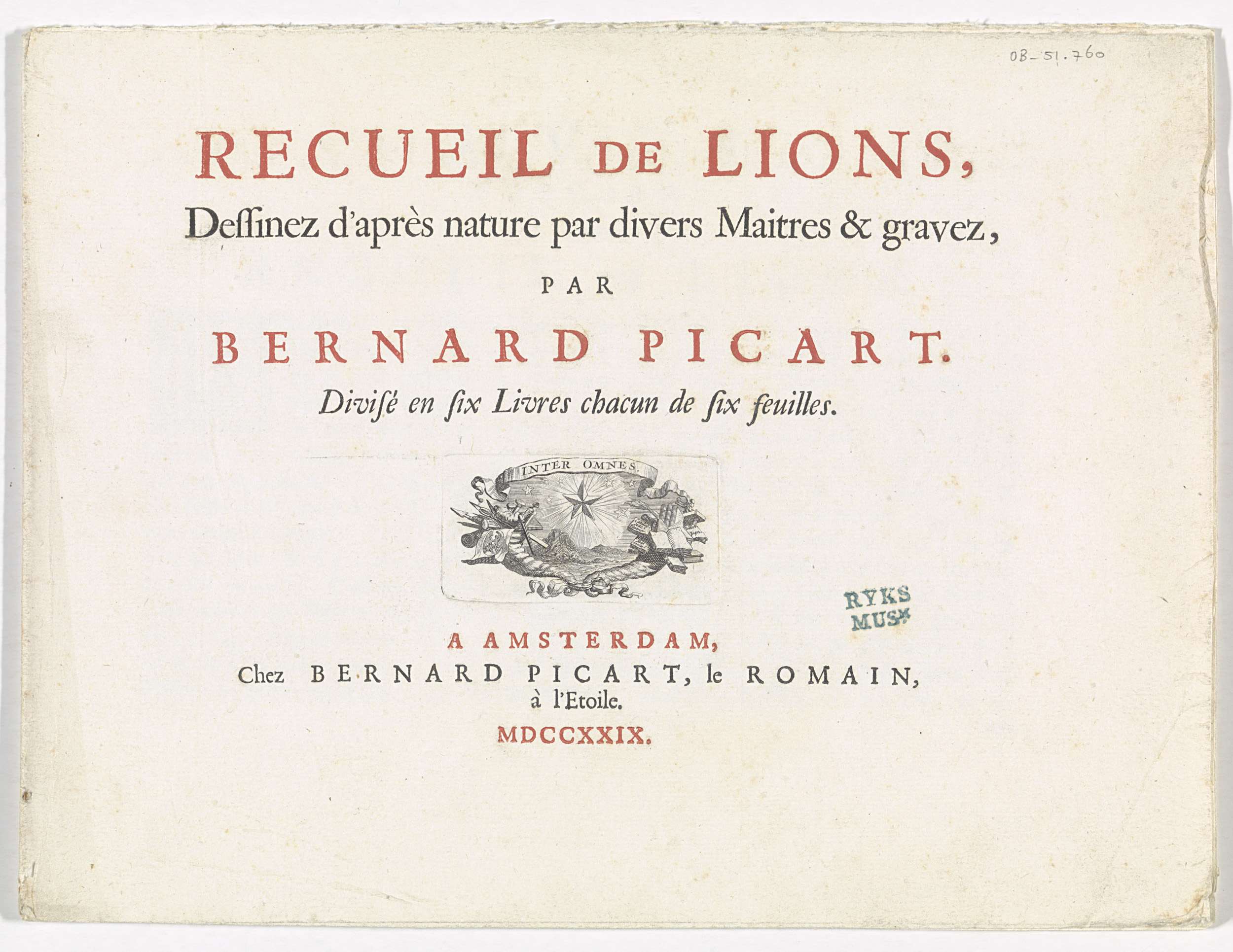 Titelpagina voor: B. Picart, Recueil de lions, 1729
