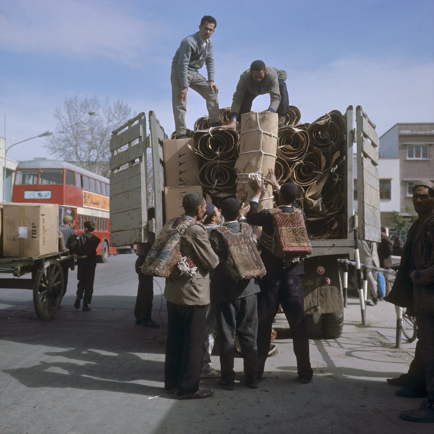 Het laden van huiden in een vrachtwagen in Teheran, ...