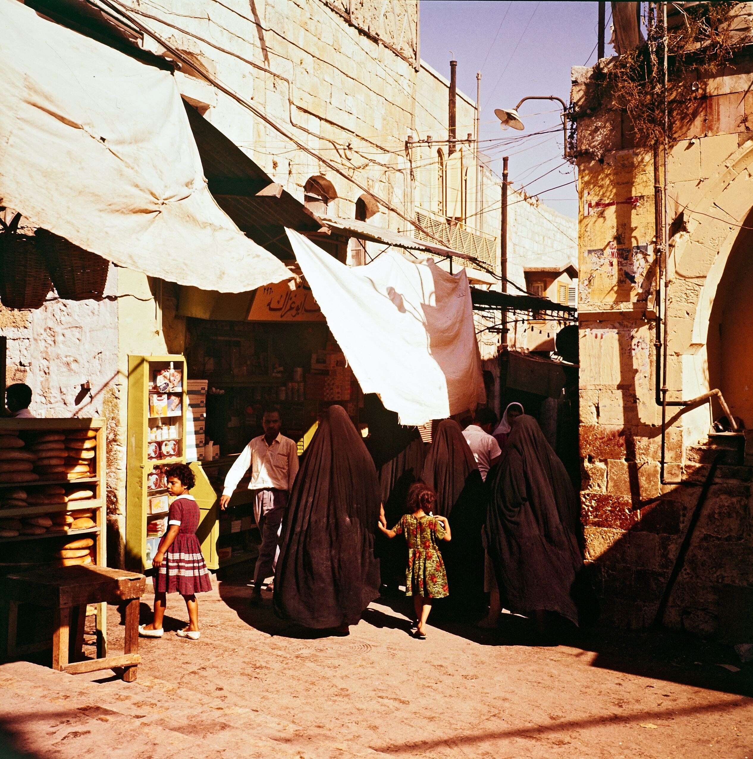 Winkelstraatje in Jerusalem met gesluierde vrouwen.