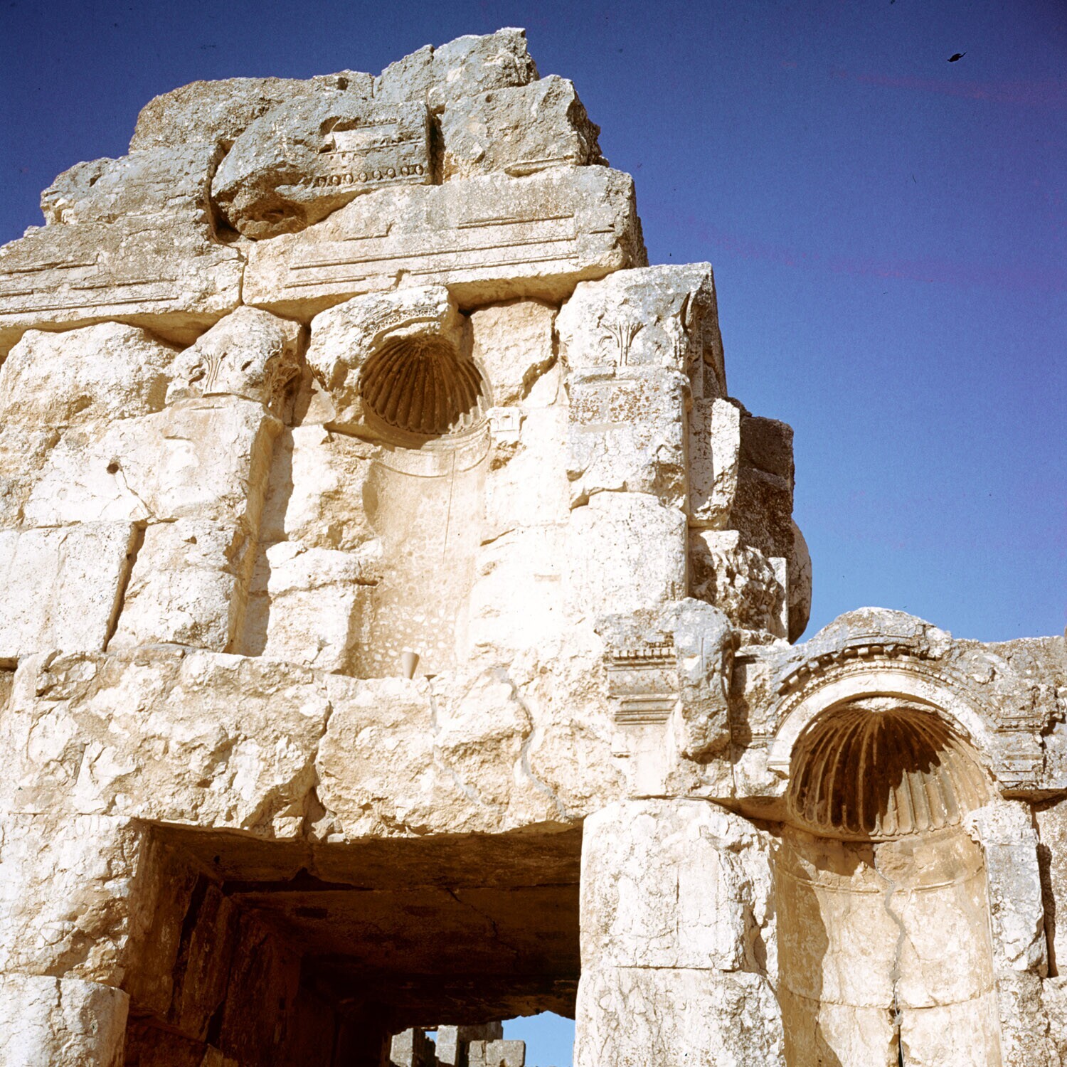 Baalbek. Detail van een muur met een poortje en twee...