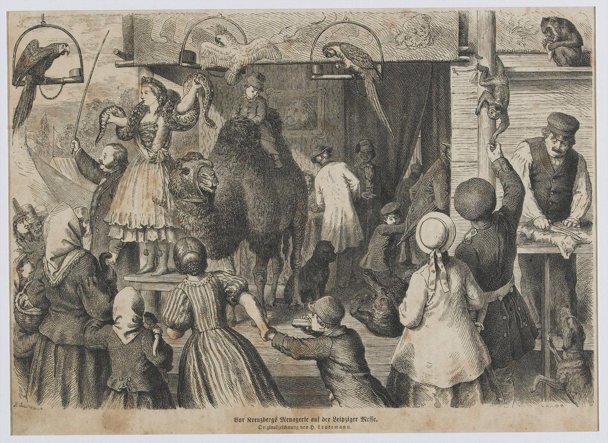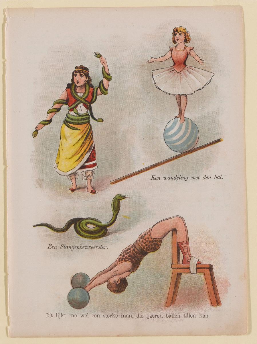 Parade voor het circus met vrouw met slang, aapjes, ...