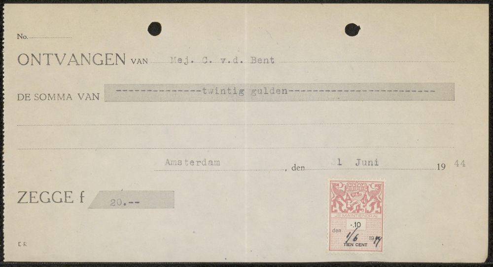 kwitantie voor de somma va fl. 20,00