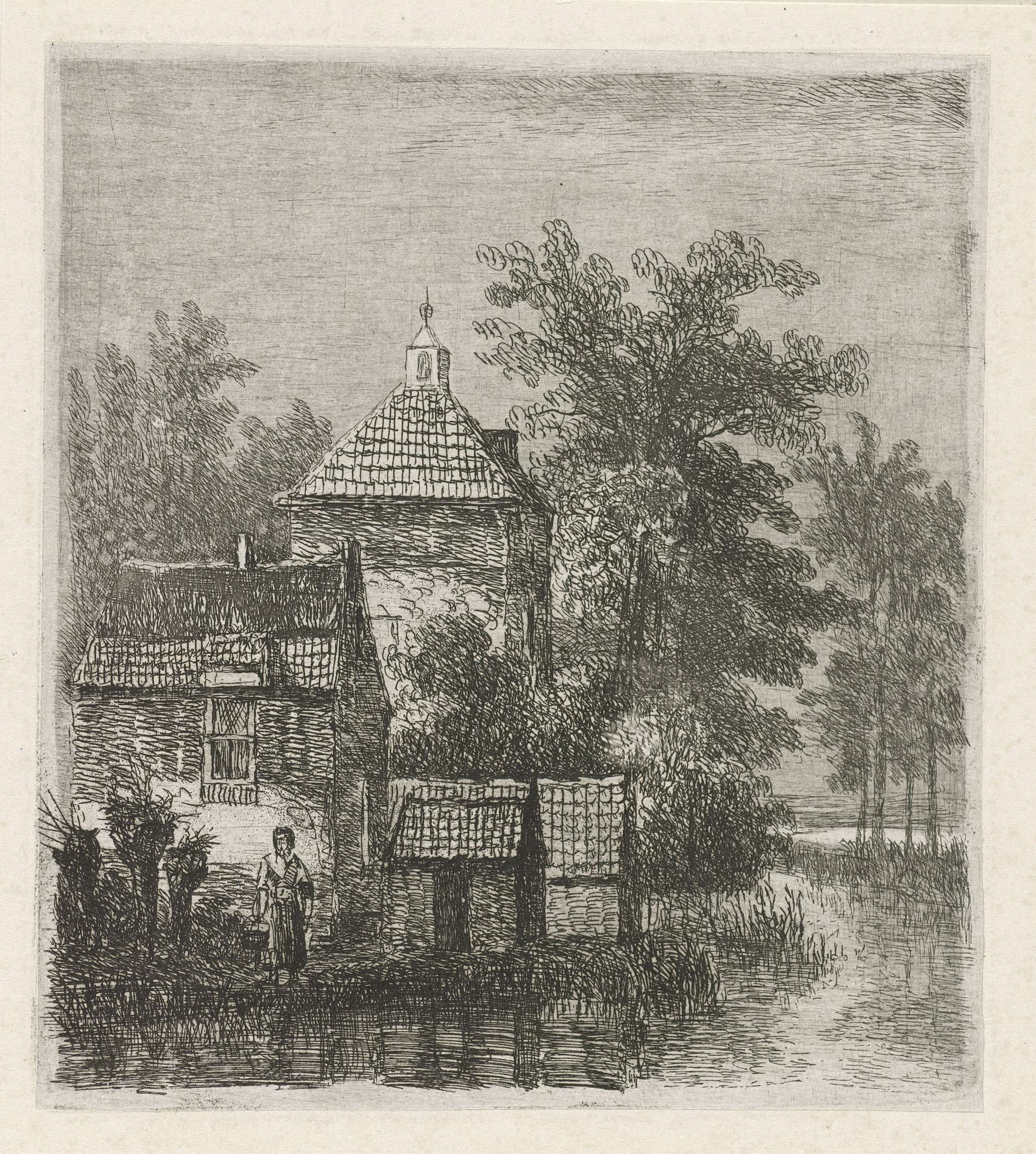 Vrouw met emmer voor huis aan een vaart