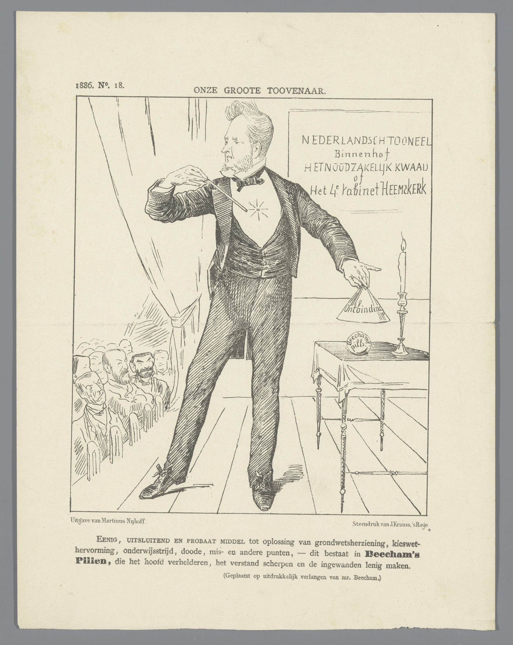 Spotprent met minister Heemskerk als goochelaar, 1886