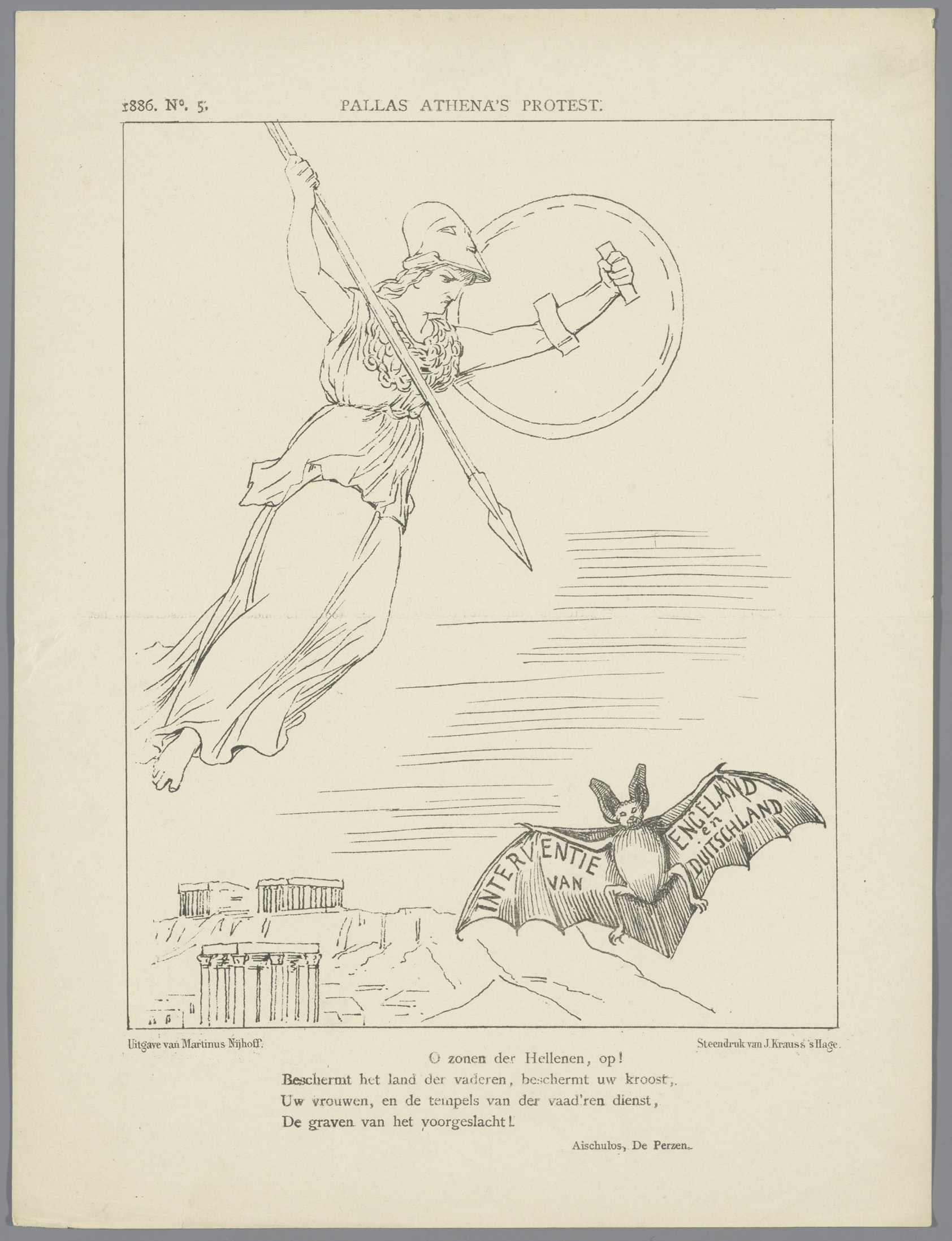 Spotprent met Themis op het Binnenhof, 1885