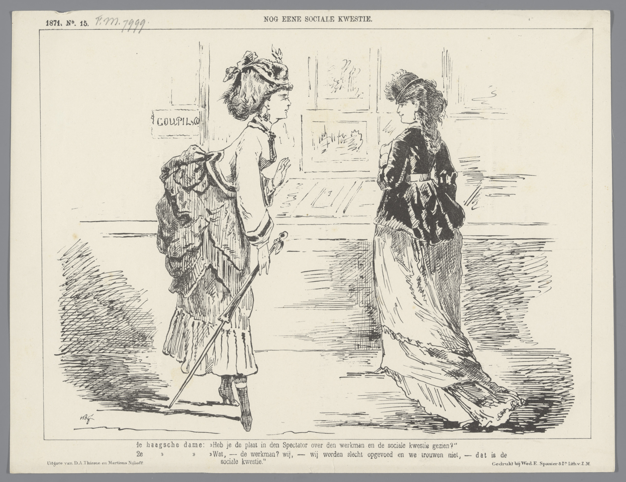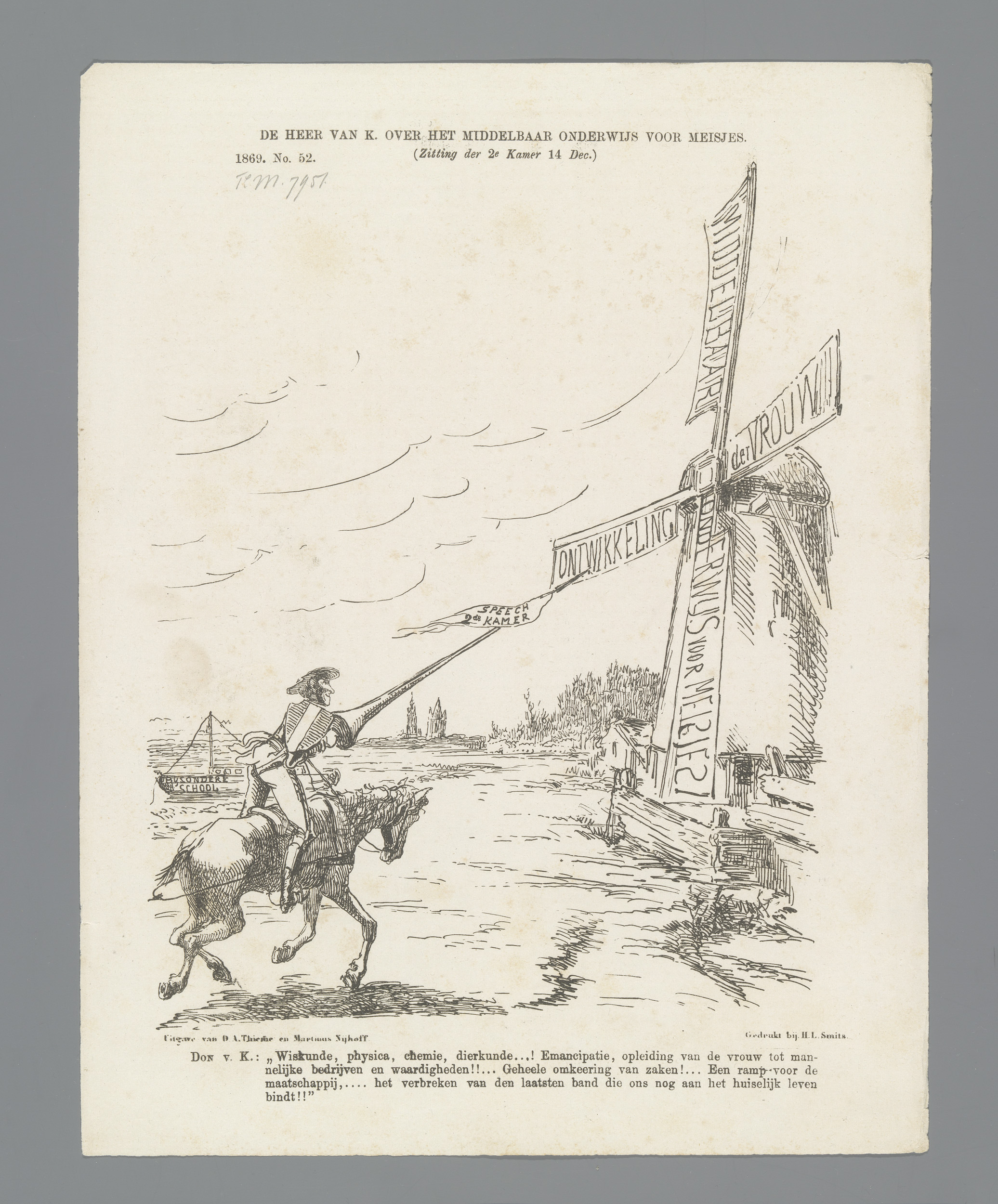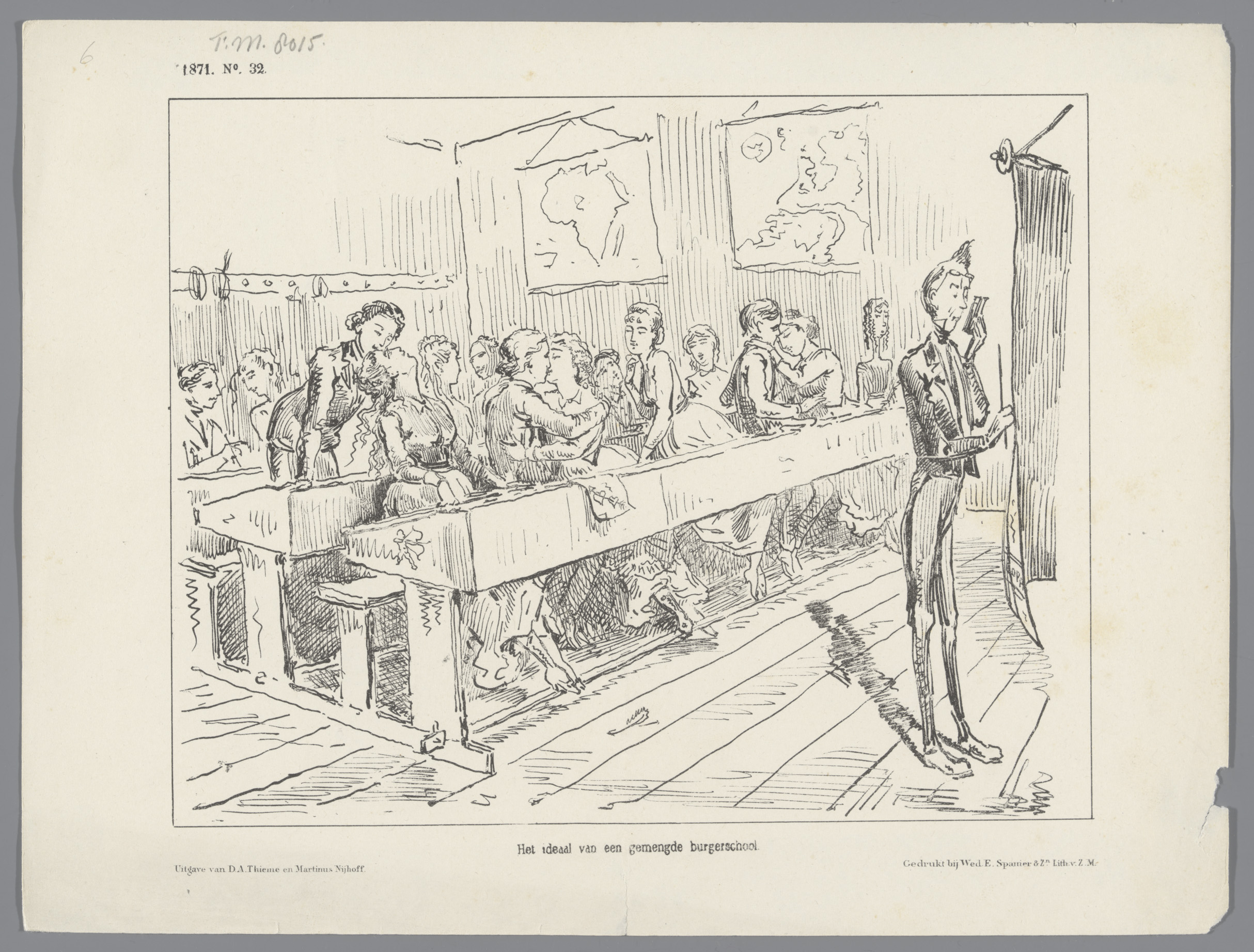 Spotprent over middelbaar onderwijs voor meisjes, 1871
