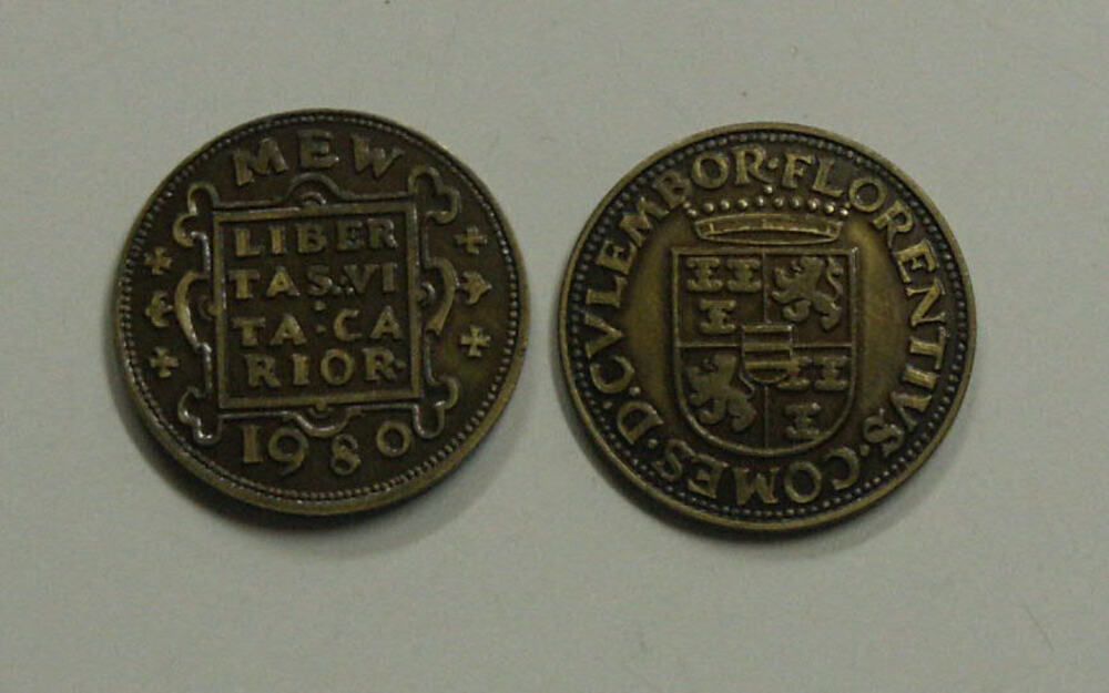 2 bronzen munten, replica van een Culemborgse Oord, ...