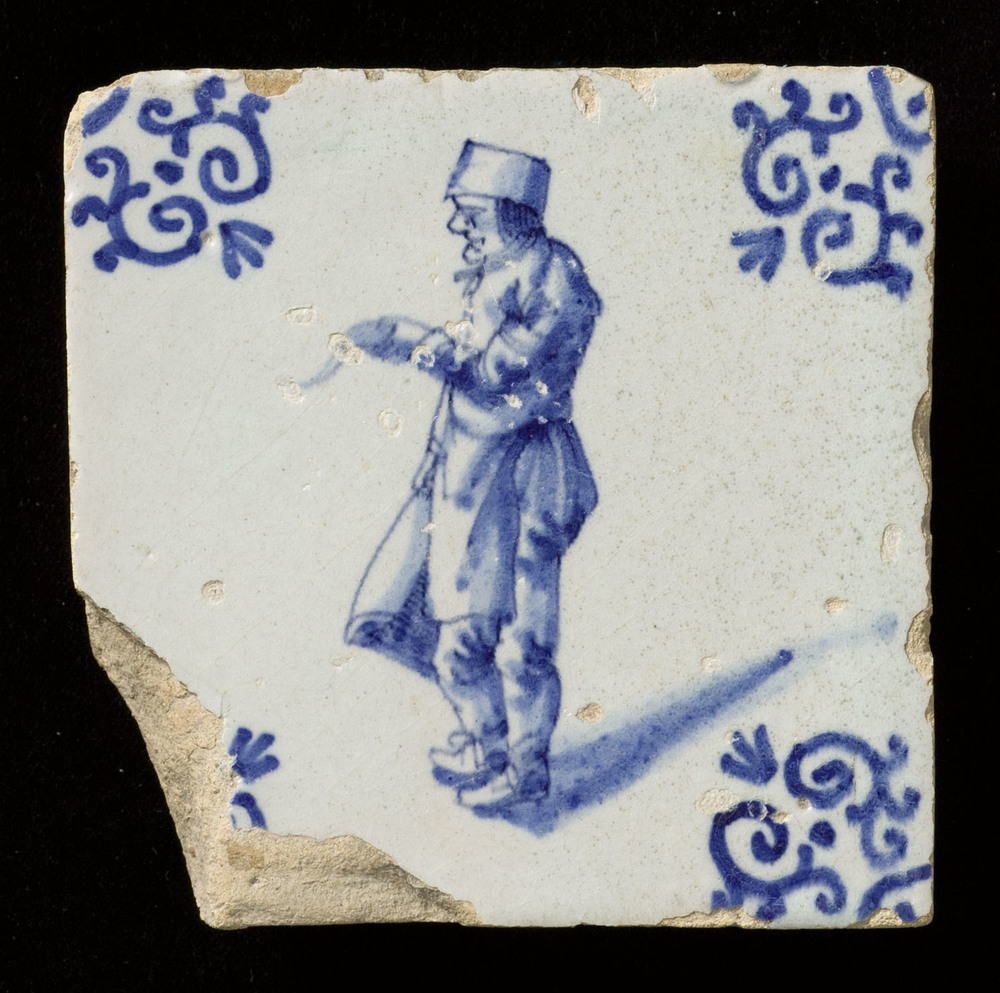 Tegel in tinglazuur, voorstellende staande man, verv...