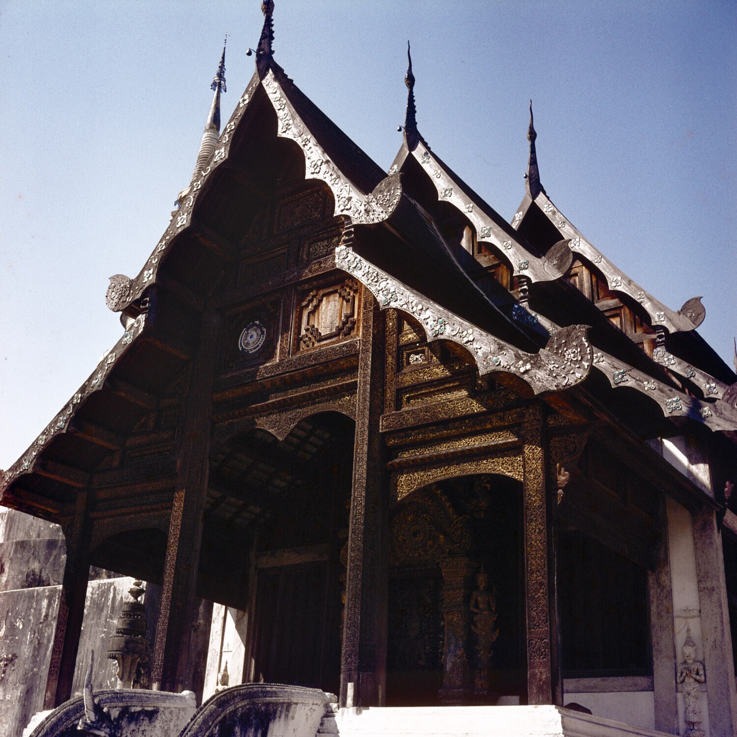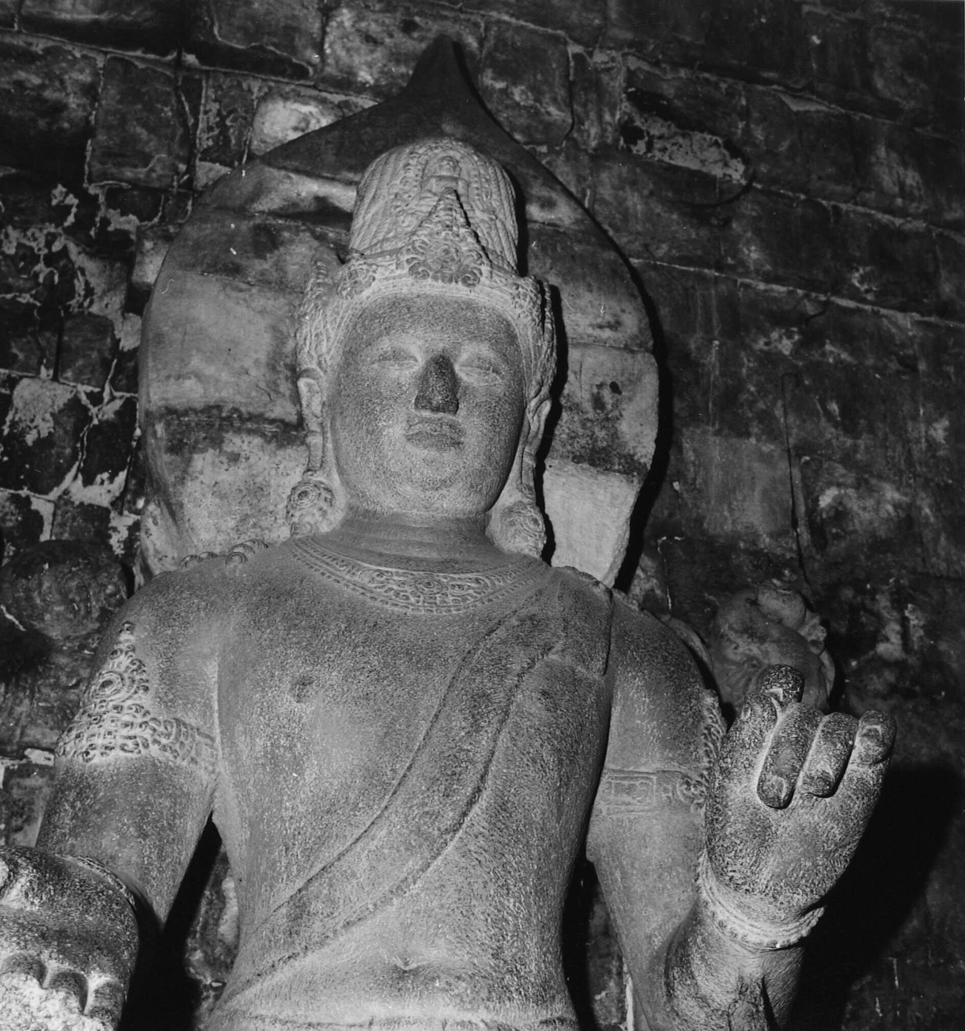 Detail van het beeld van bodhisattva Maitreya in de ...
