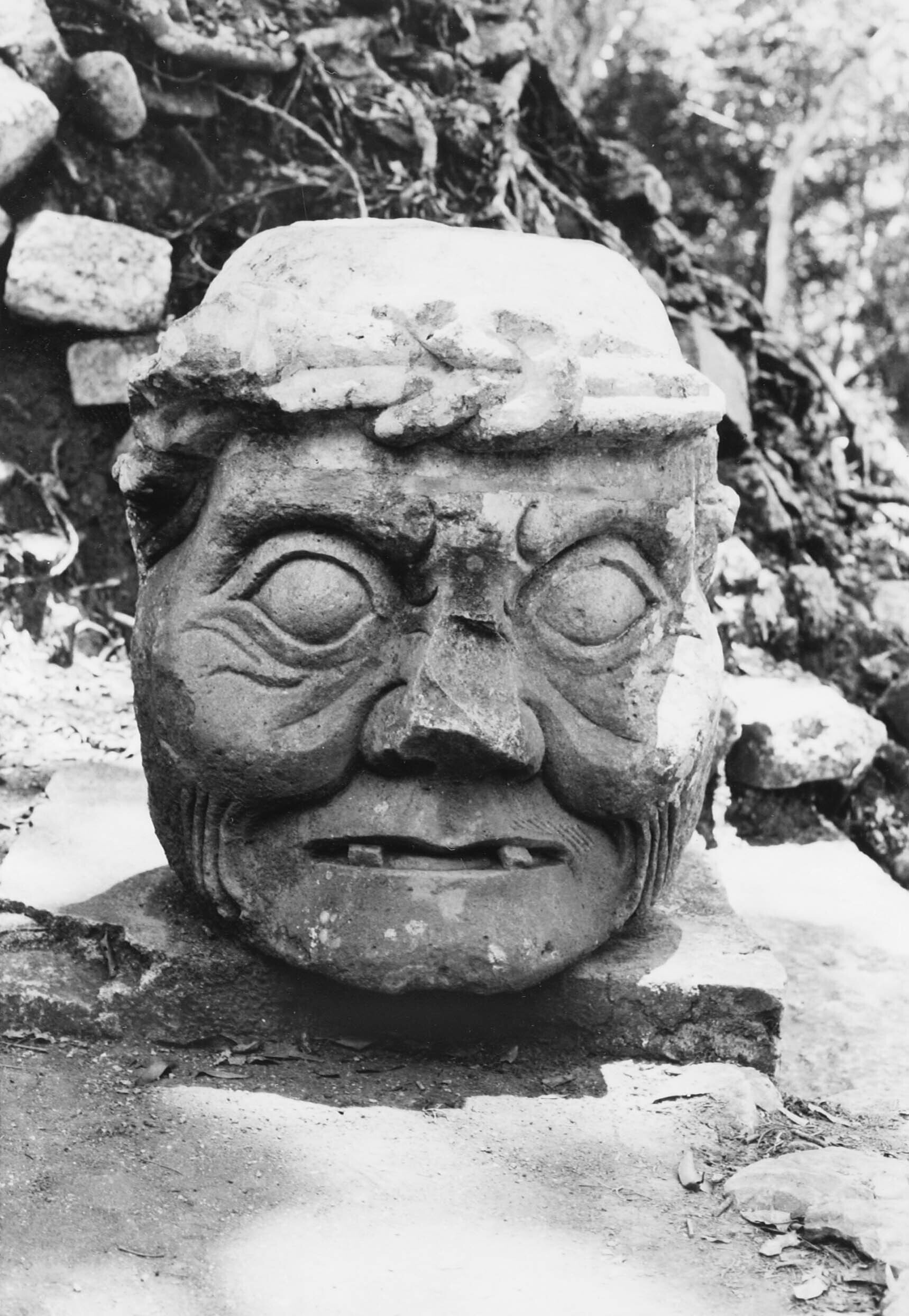 Stenen hoofd van een Maya god op het ruïnecomplex va...