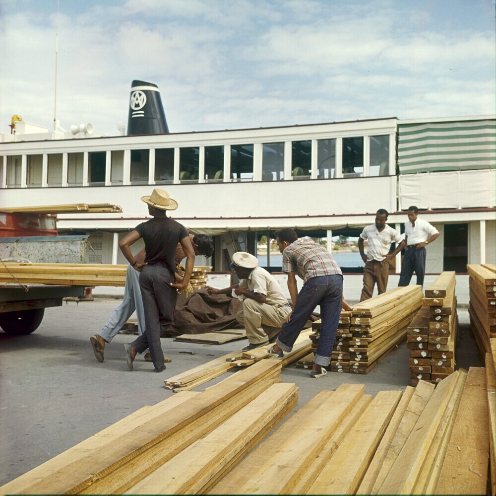 Afladen van hout bij de haven van Kralendijk