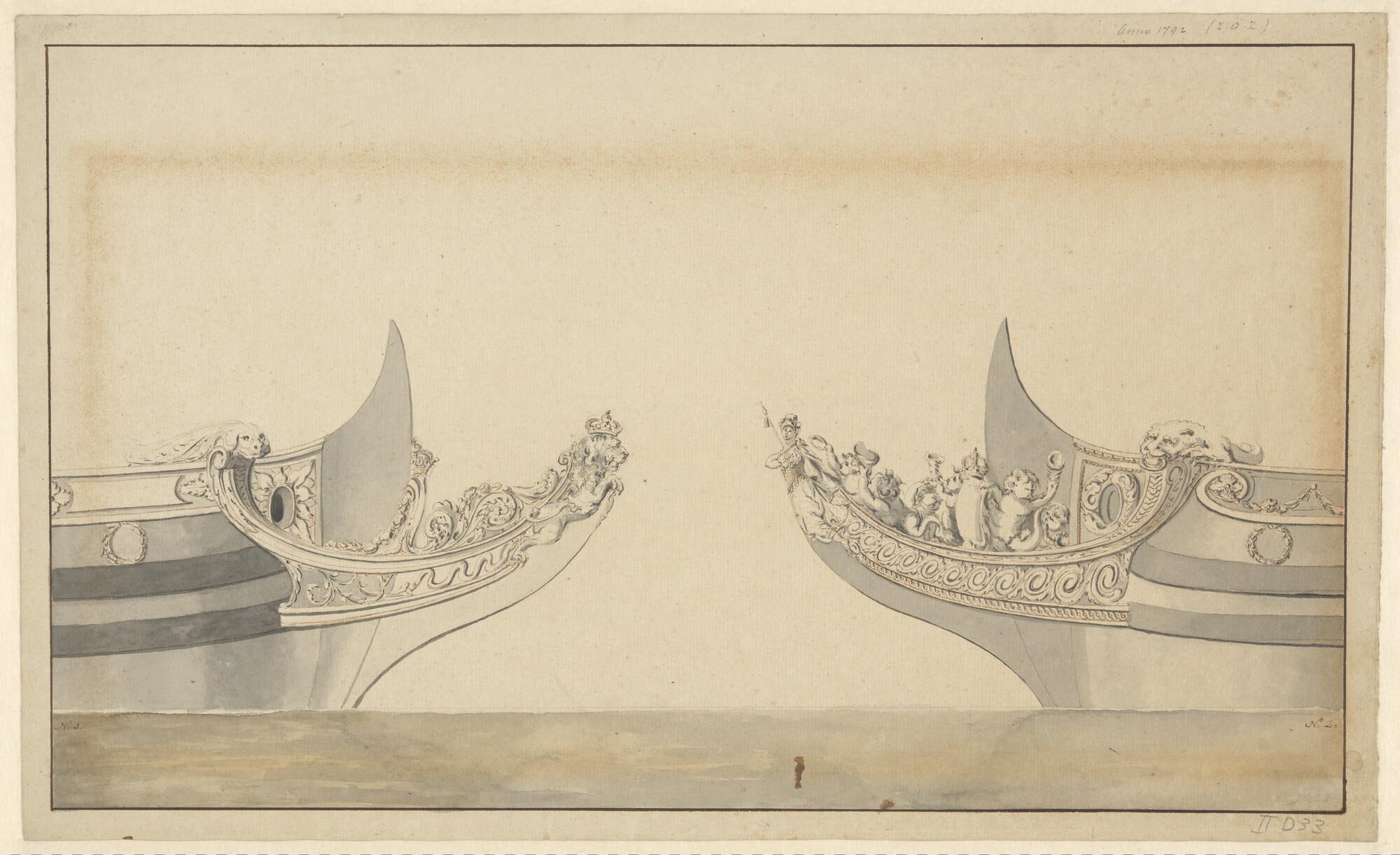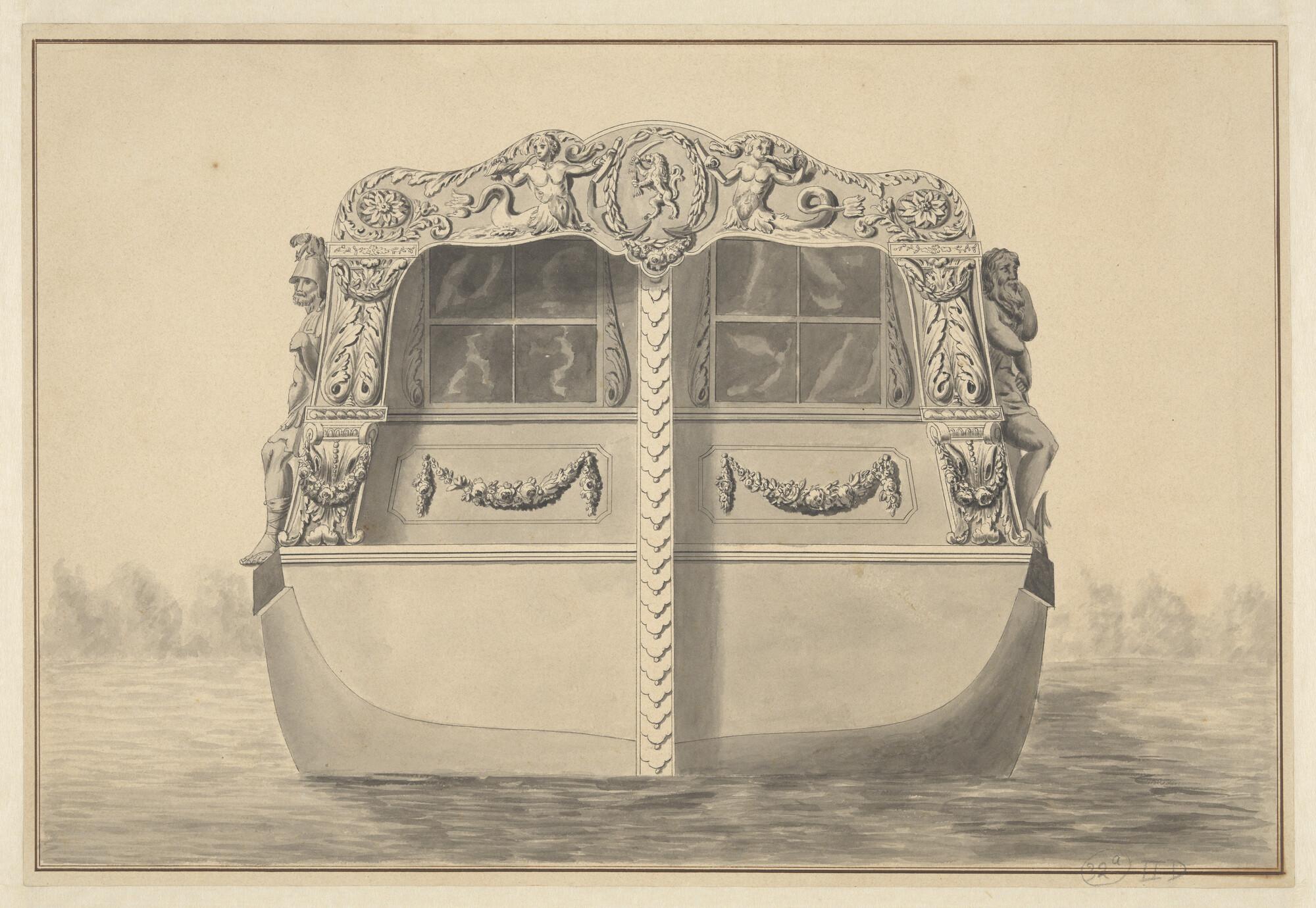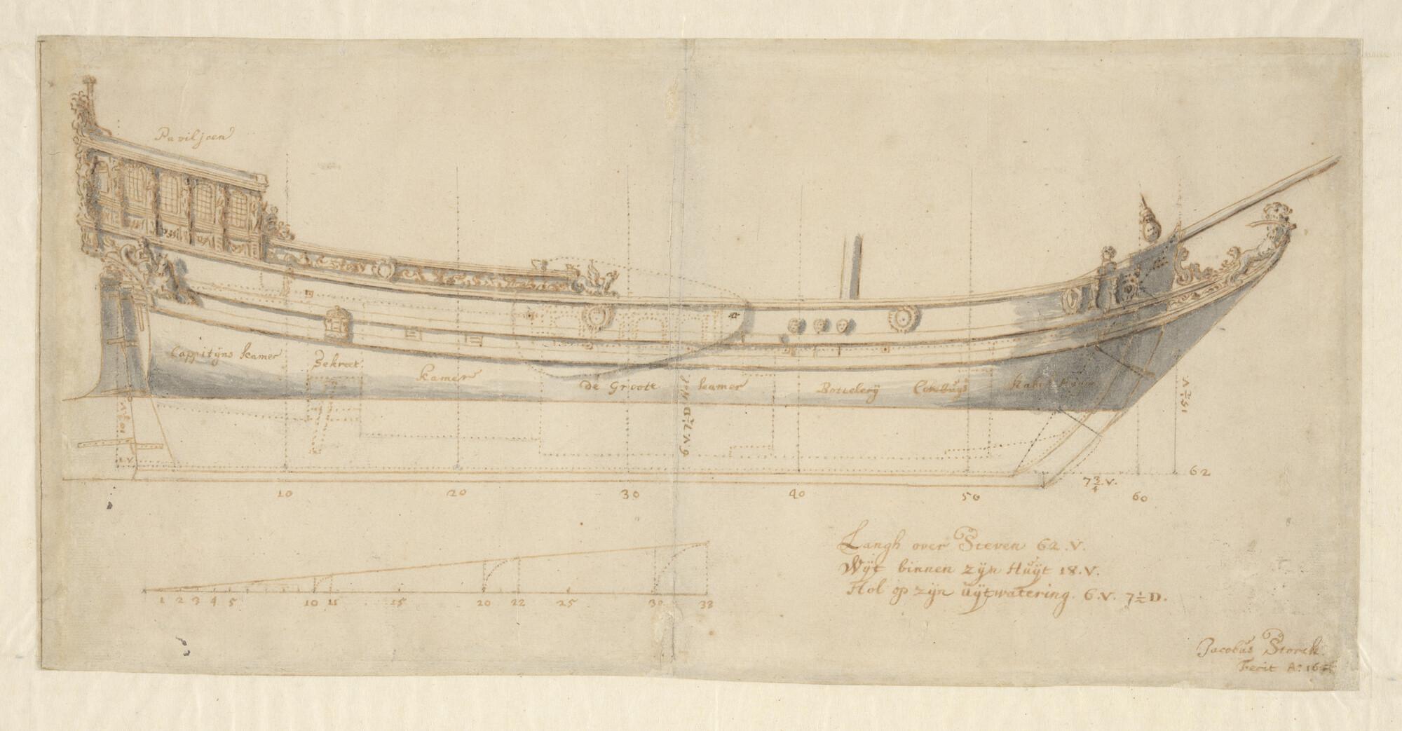 Zijaanzicht en achteraanzicht van het schip 'Boekenr...