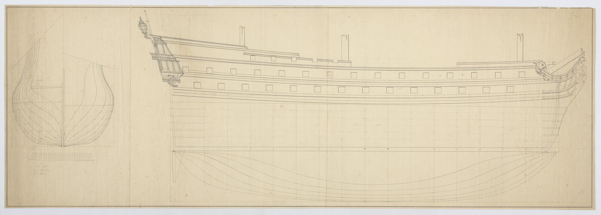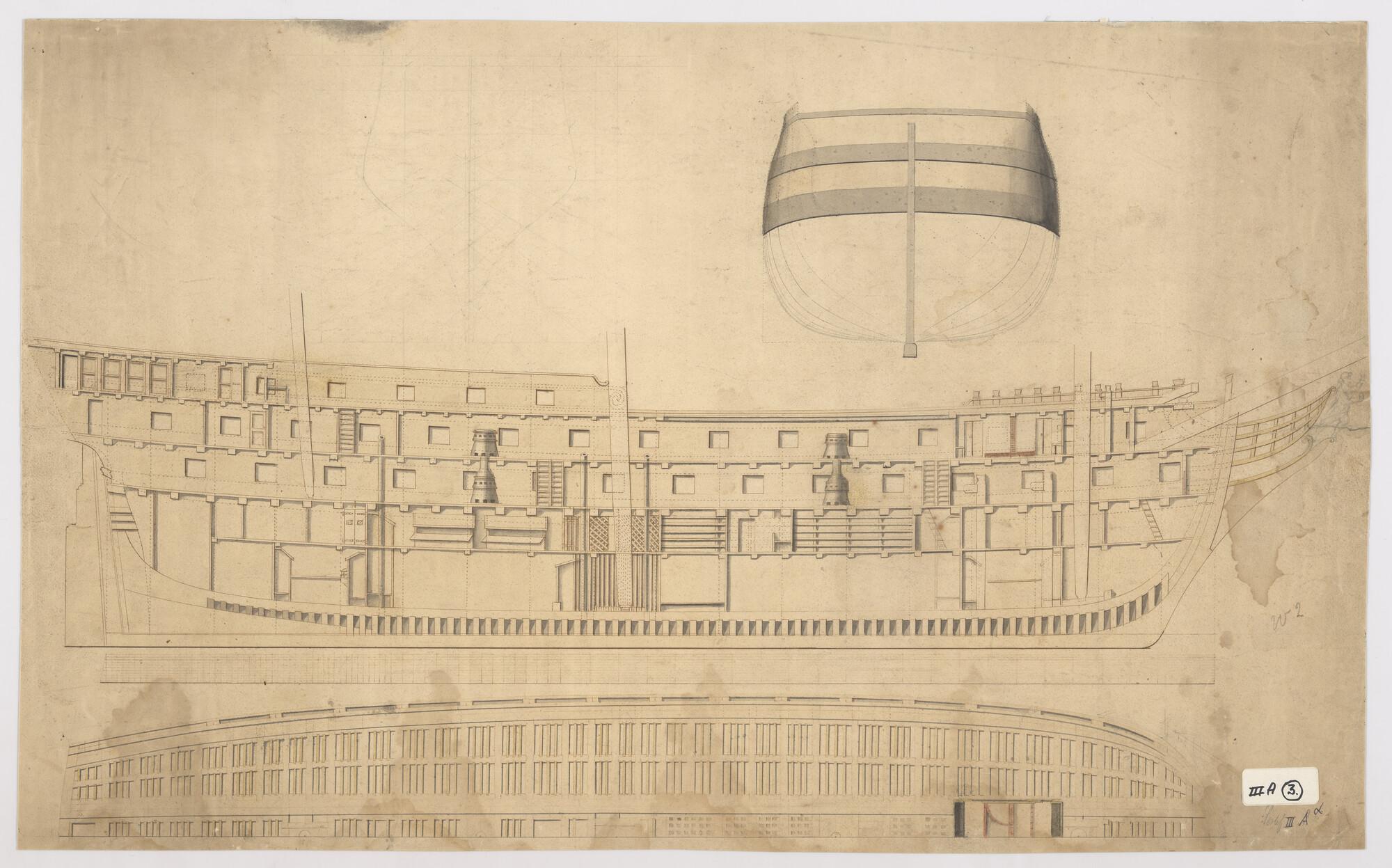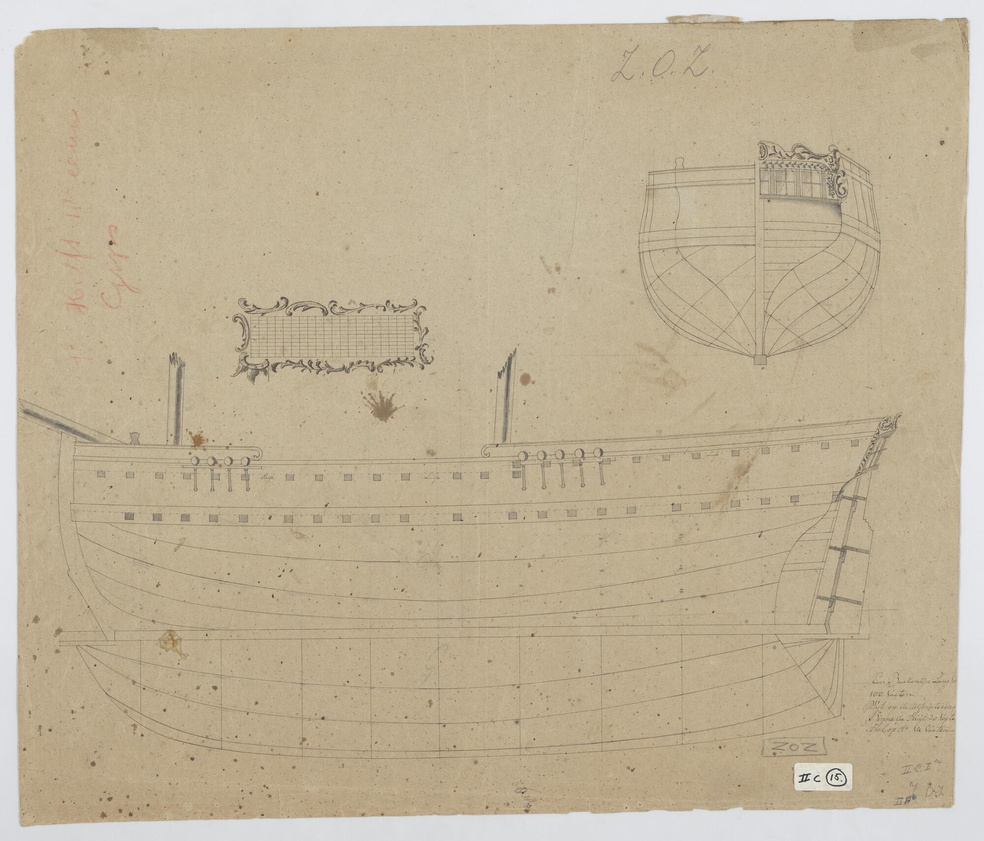 Lijnenplan van een Frans oorlogsschip van 100 stukken