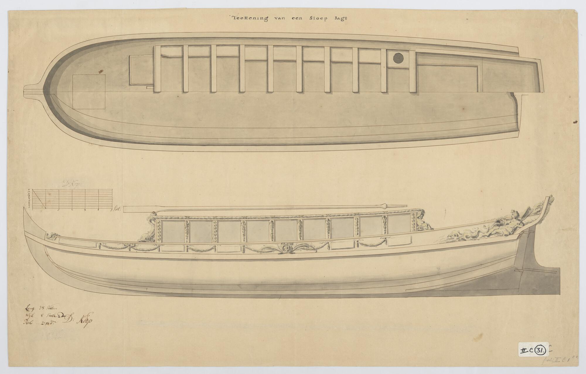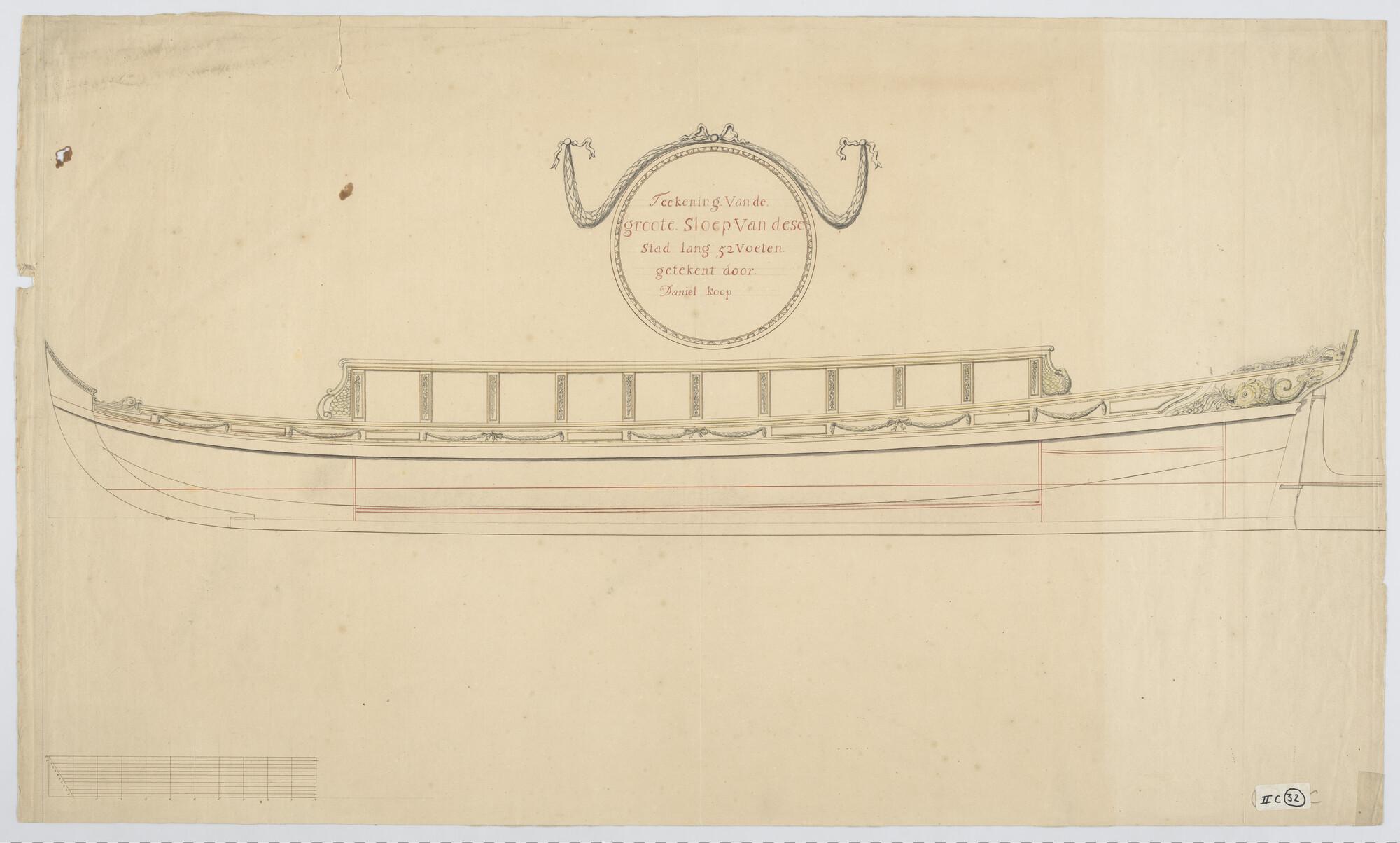 Paviljoenjacht (1733) van 20 meter (w.l.), kotter (1...