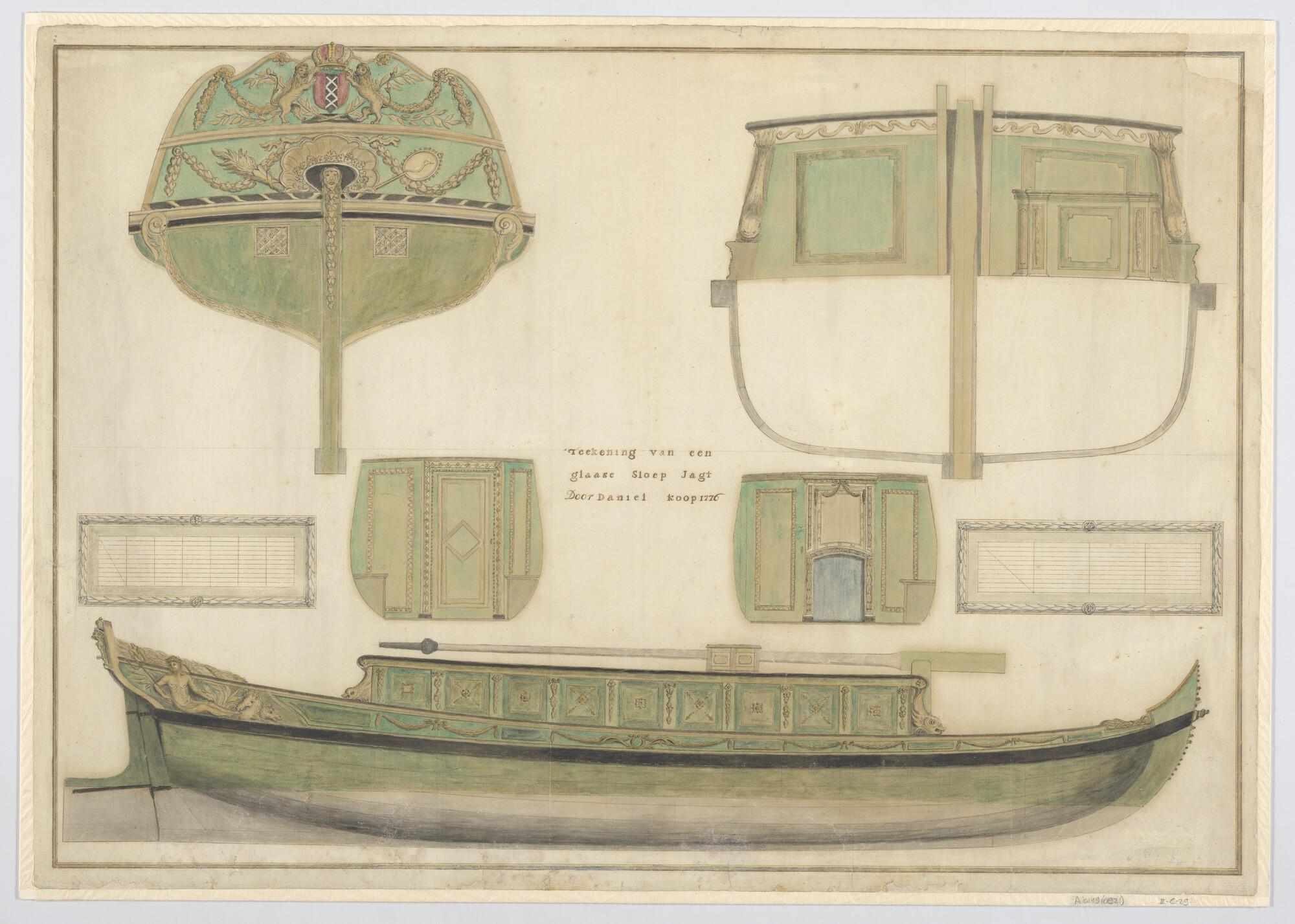 Paviljoenjacht (1733) van 20 meter (w.l.) en de scho...