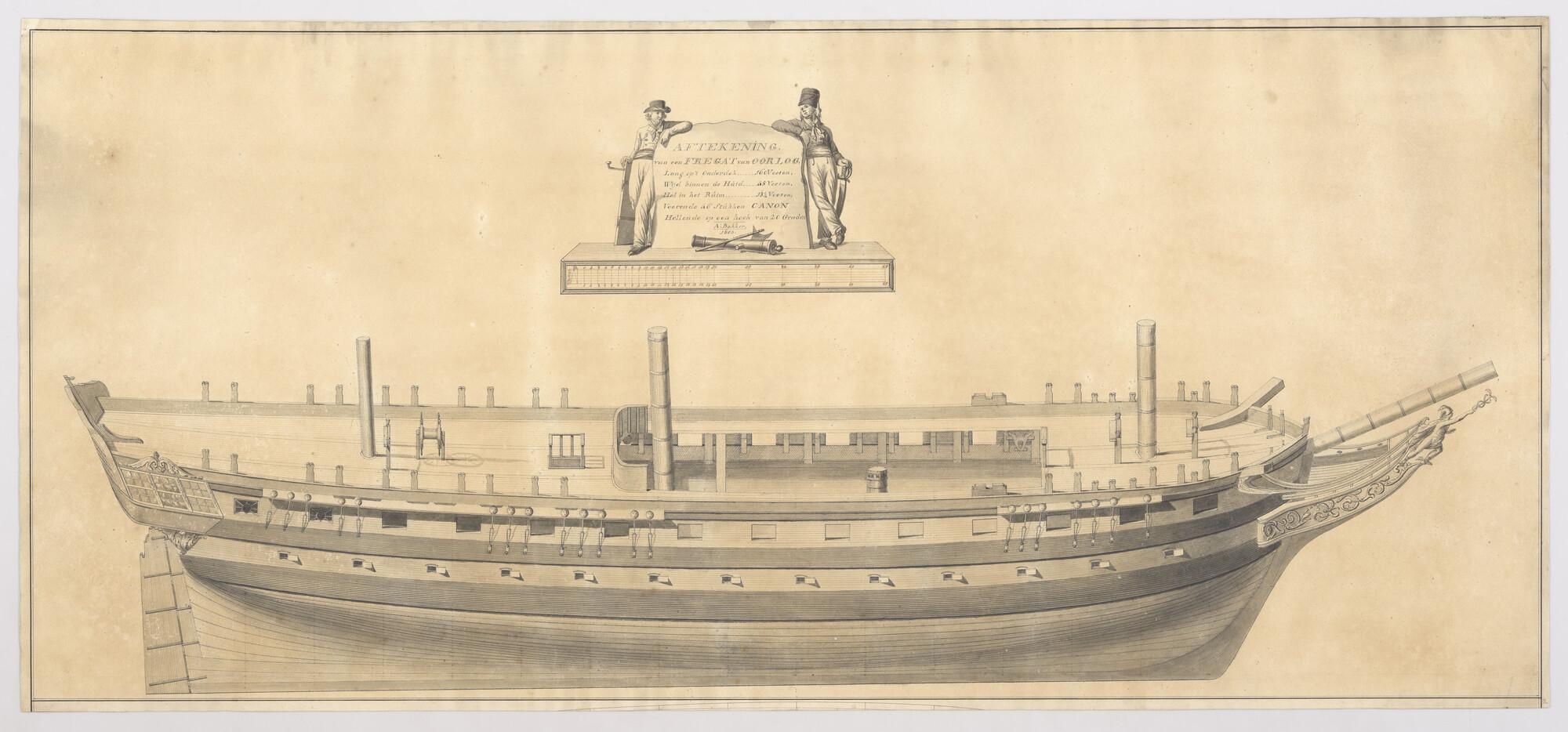 Zijaanzicht van een schip van oorlog van 46 stukken