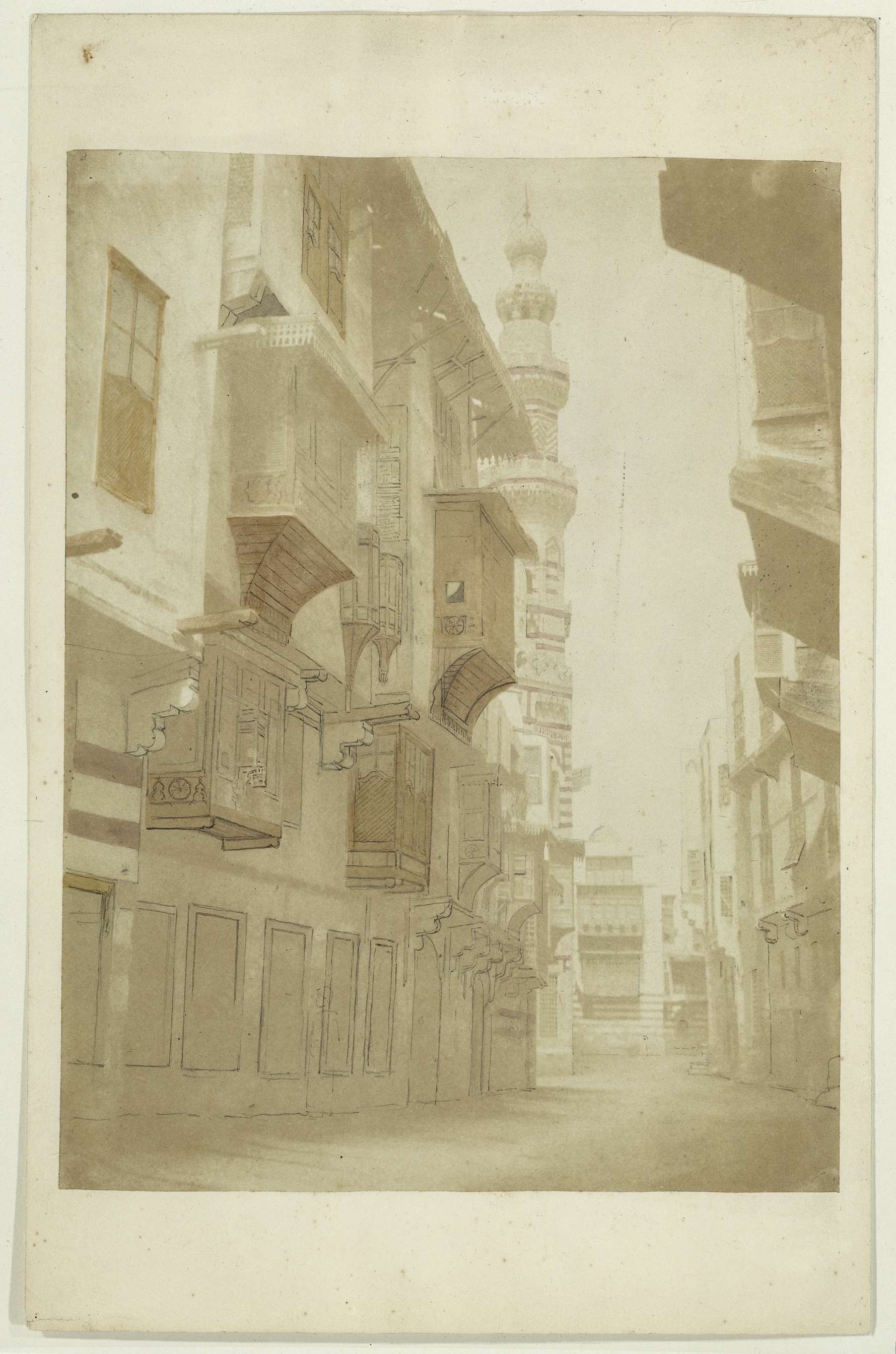 Gezicht op een straat met minaret in Cairo