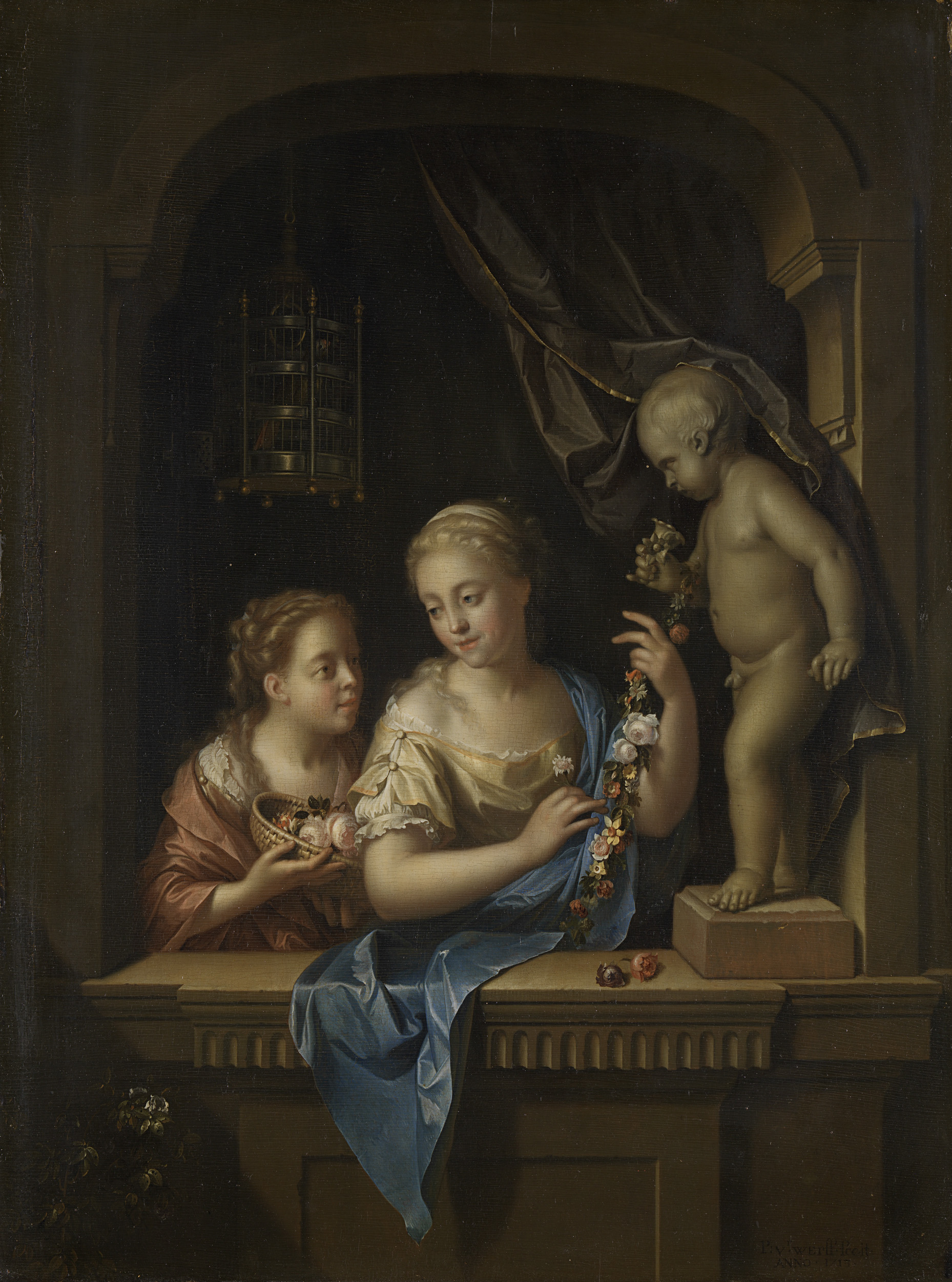 Twee meisjes met bloemen bij een beeld van Cupido
