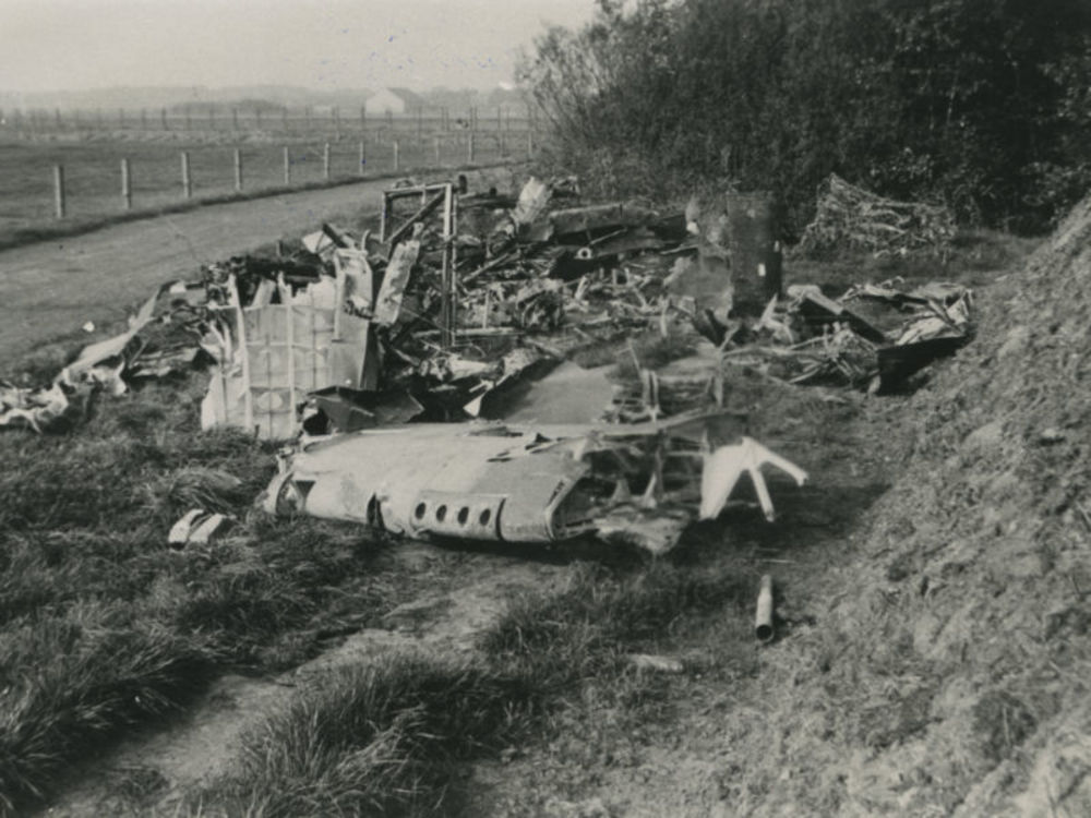 Foto vliegtuigwrak. Tekst: "Wrak van een bij Bergen ...