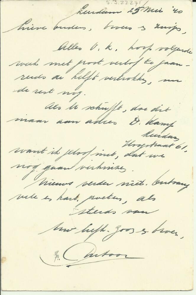 Kaart van Antoon Jeuken aan familie, 25 mei 1940