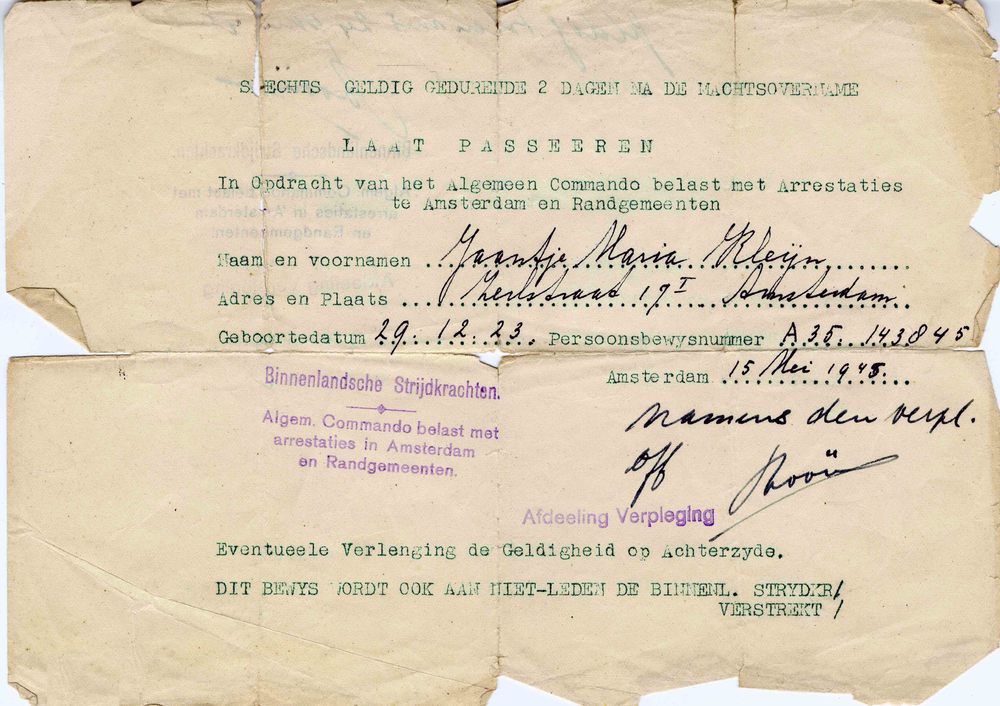 doortochtbewijs t.n.v. J.M. Kleijn. 15-05-1945 en do...