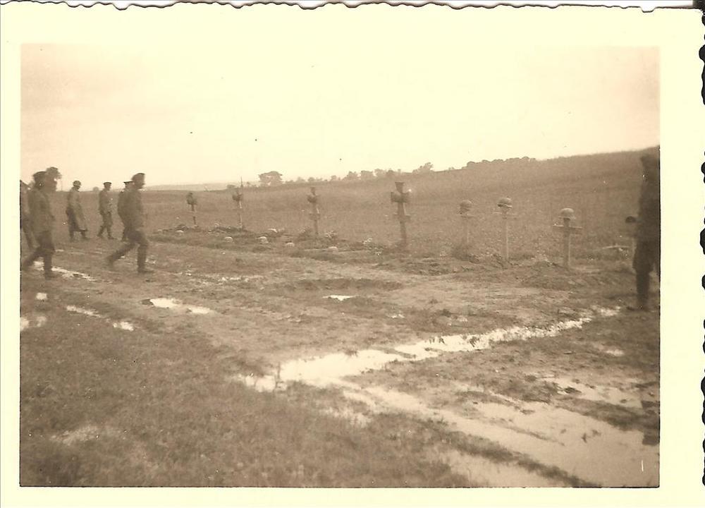 Duitse soldatengraven langs een weg met Duitse milit...