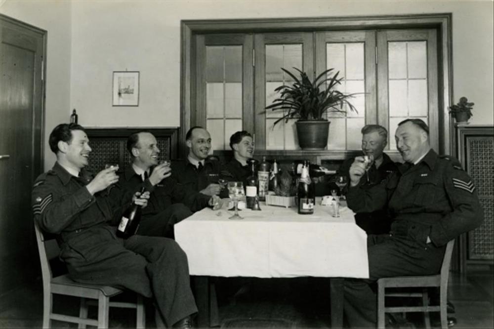 zes militairen in RAF uniform rondom een tafel