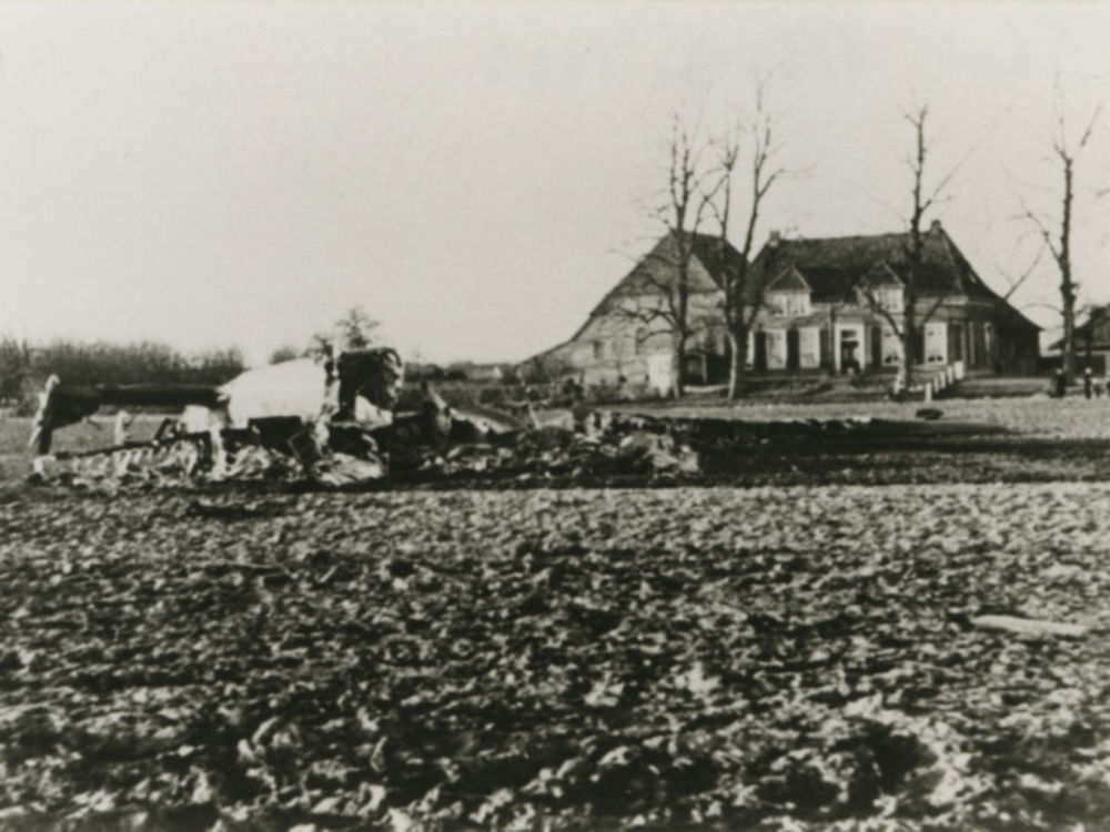 Foto van restanten neergestort vliegtuig voor boerderij