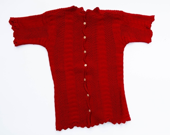 Rode borstrok met knoopsluiting van ajourbreiwerk