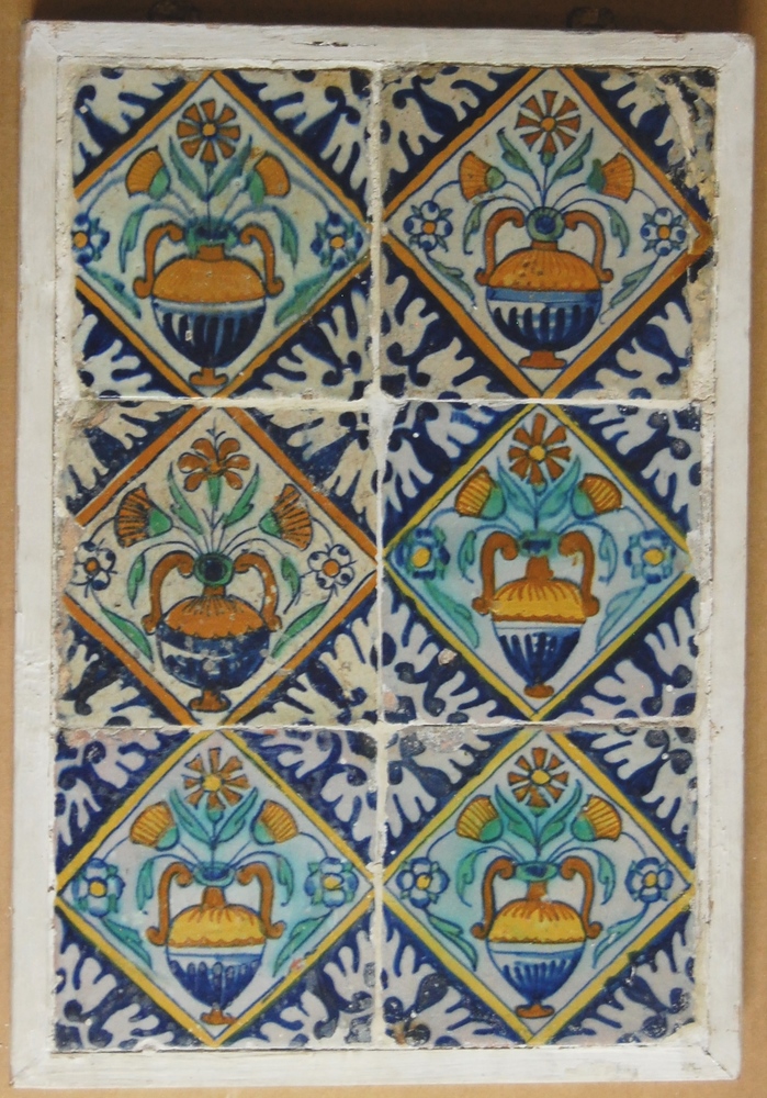 tegelveld. Zes gekleurde tegels met rijke versiering...