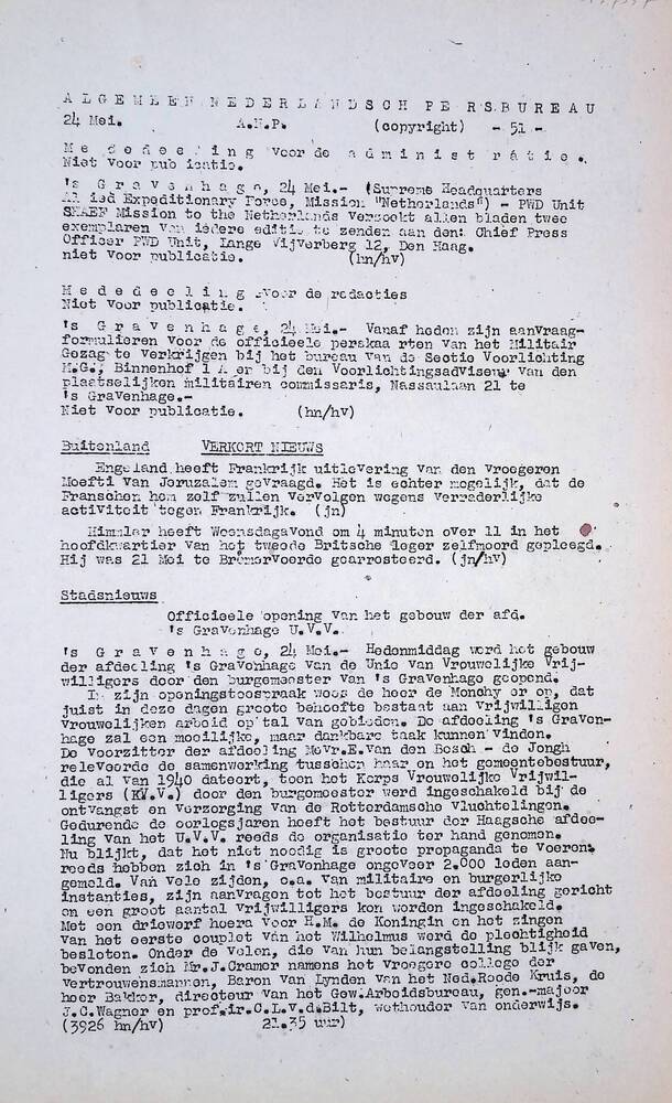 Algemeen Nederlandsch Persbureau, mededelingen, 24 m...
