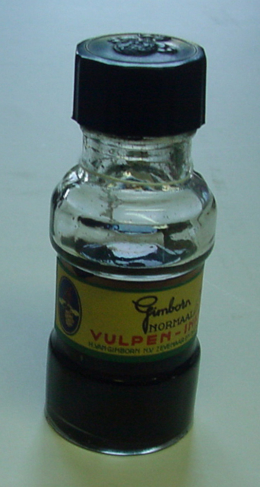 Fles van glas gevuld met normaal vulpeninkt H. van G...