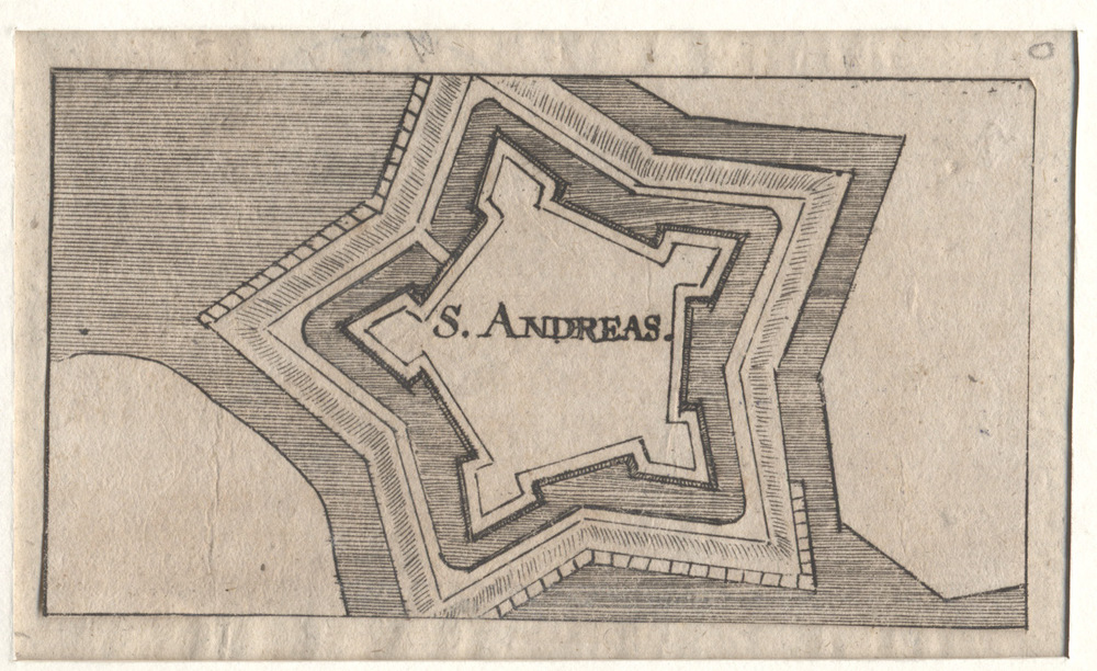 plattegrond in stervorm van St. Andries. Gravure.