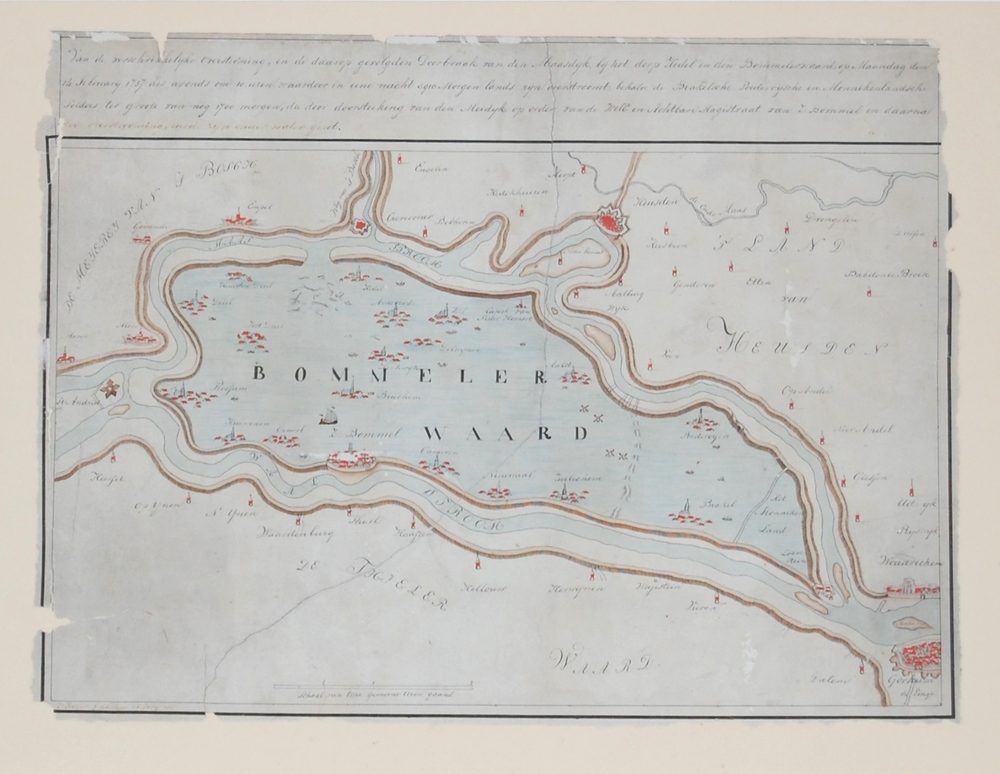 kaart van doorbraak Maasdijk, Hedel in 1757. Opschri...