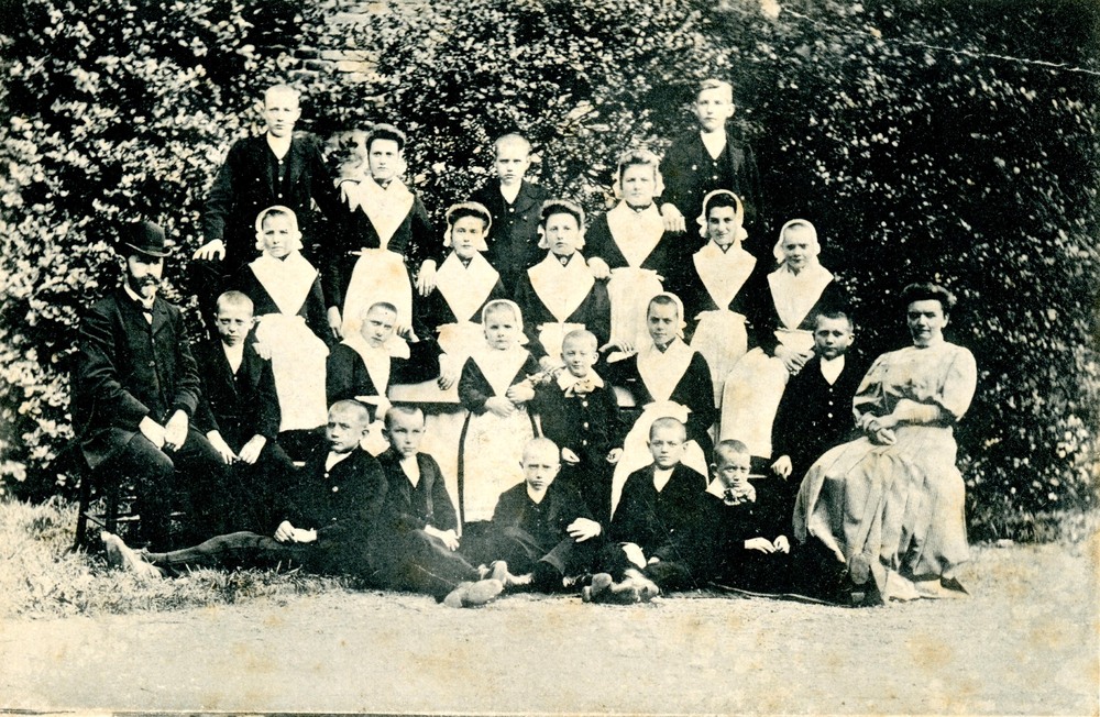 Ansichtkaart, voorstellende een groep weeskinderen v...