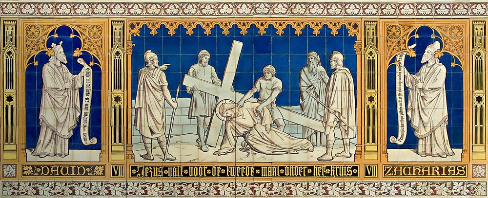Tegeltableau, voorstellende de 7e statie van een kru...