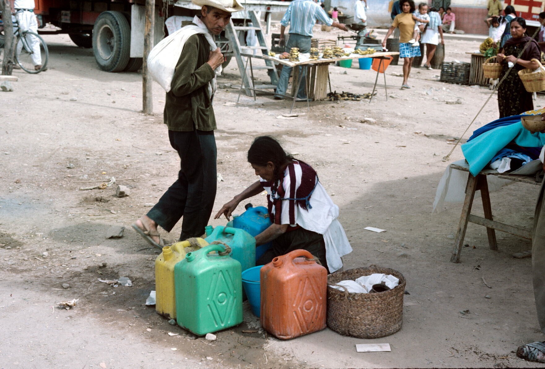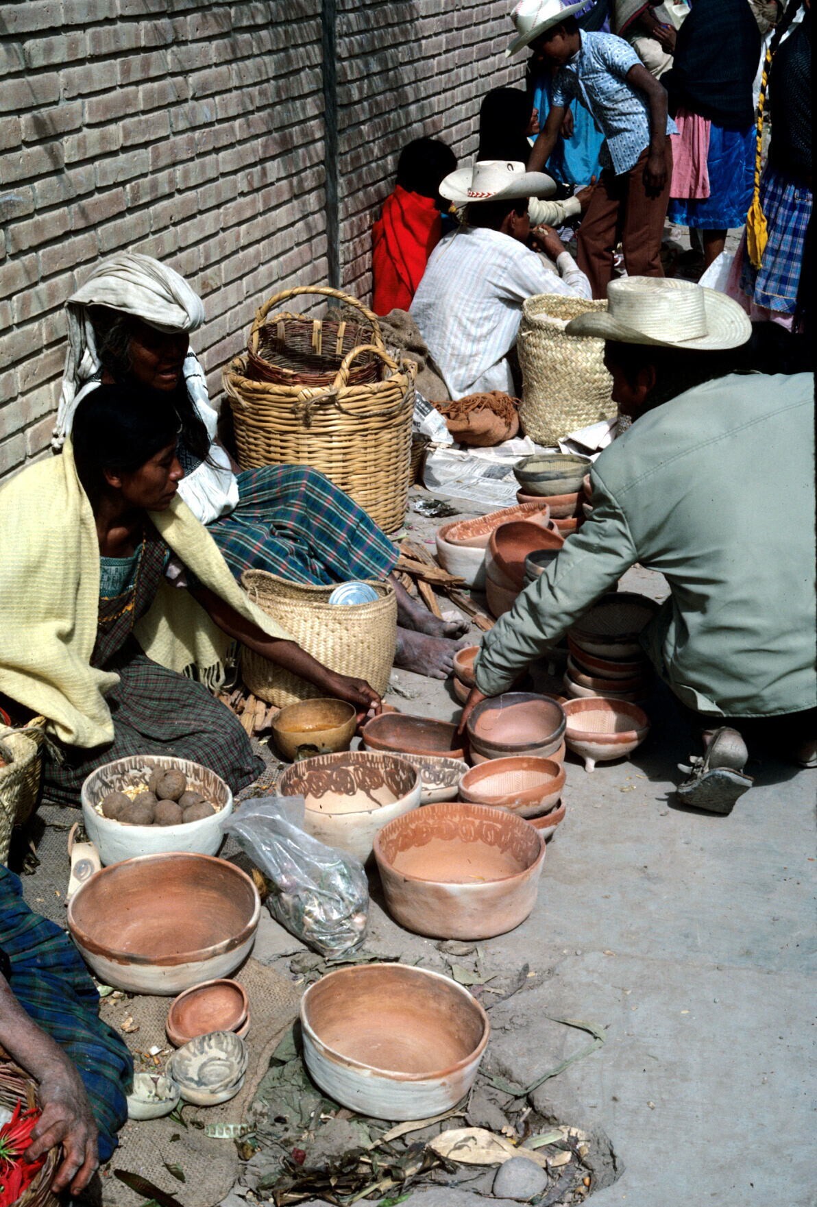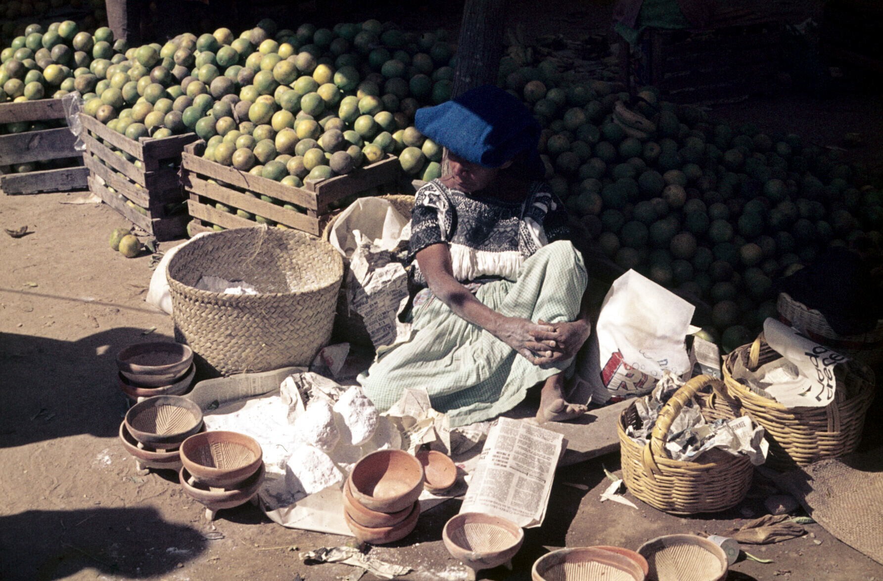 marktkoopvrouw met aardewerk, o.a. molcajetes (wrijf...
