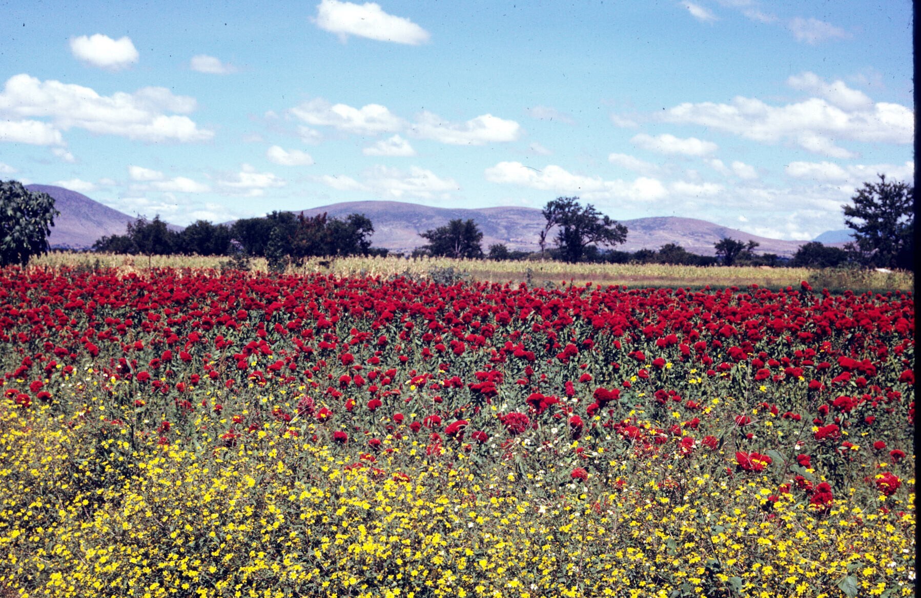 veld met rode bloemen (hanekammen) en gele bloemen