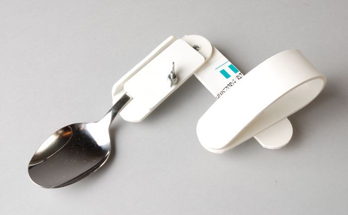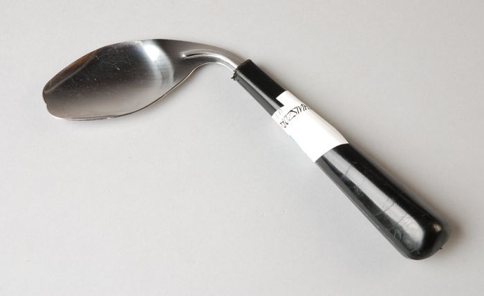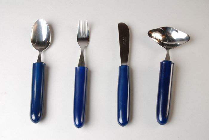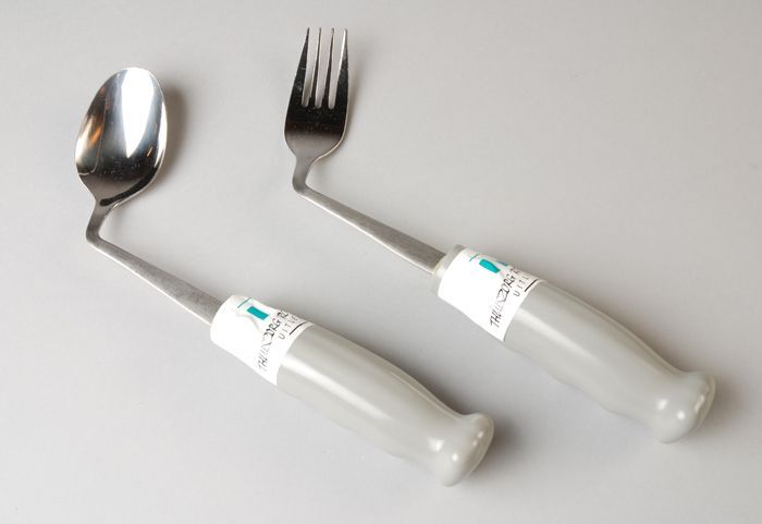 Gebogen lepel en vork, met verdikt grijs handvat
