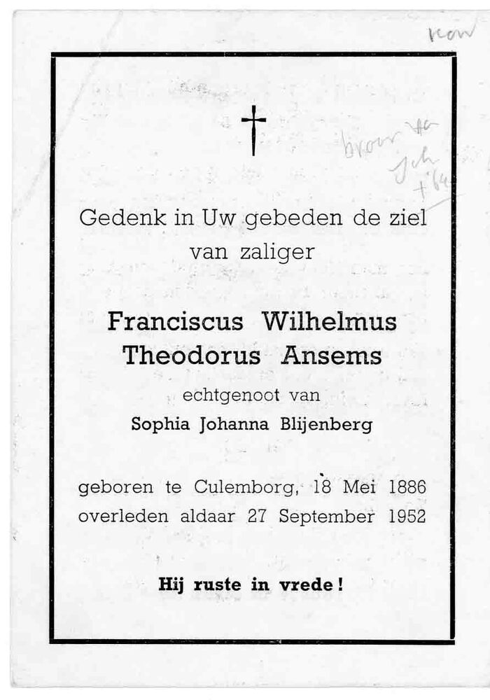 bidprent voor Fransiscus Wilhelmus Theodorus Ansems....