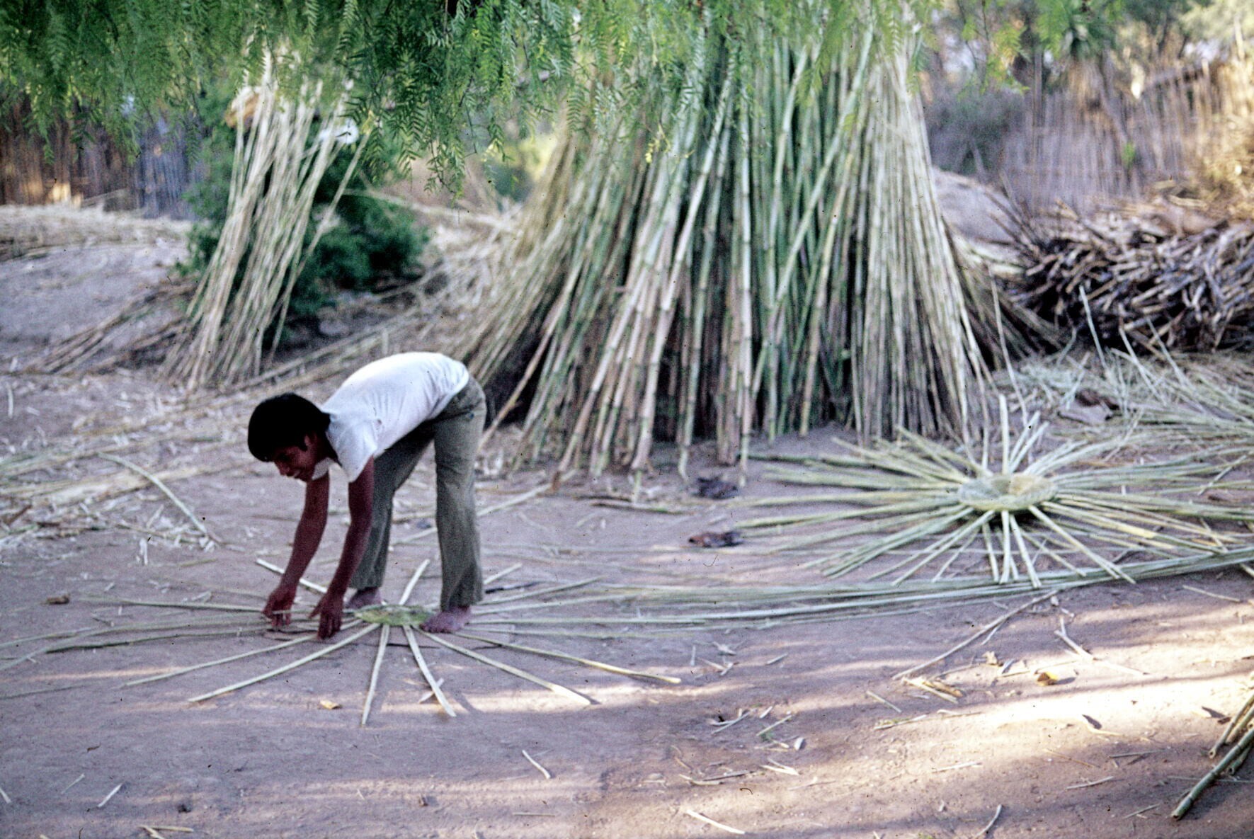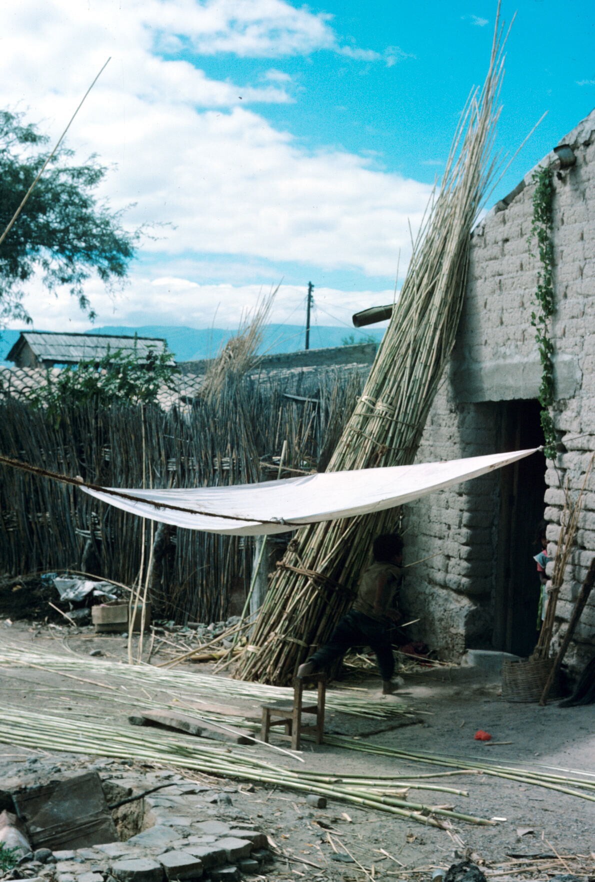 meisje, mand vlechtend op erf van tante zusjes Reyes