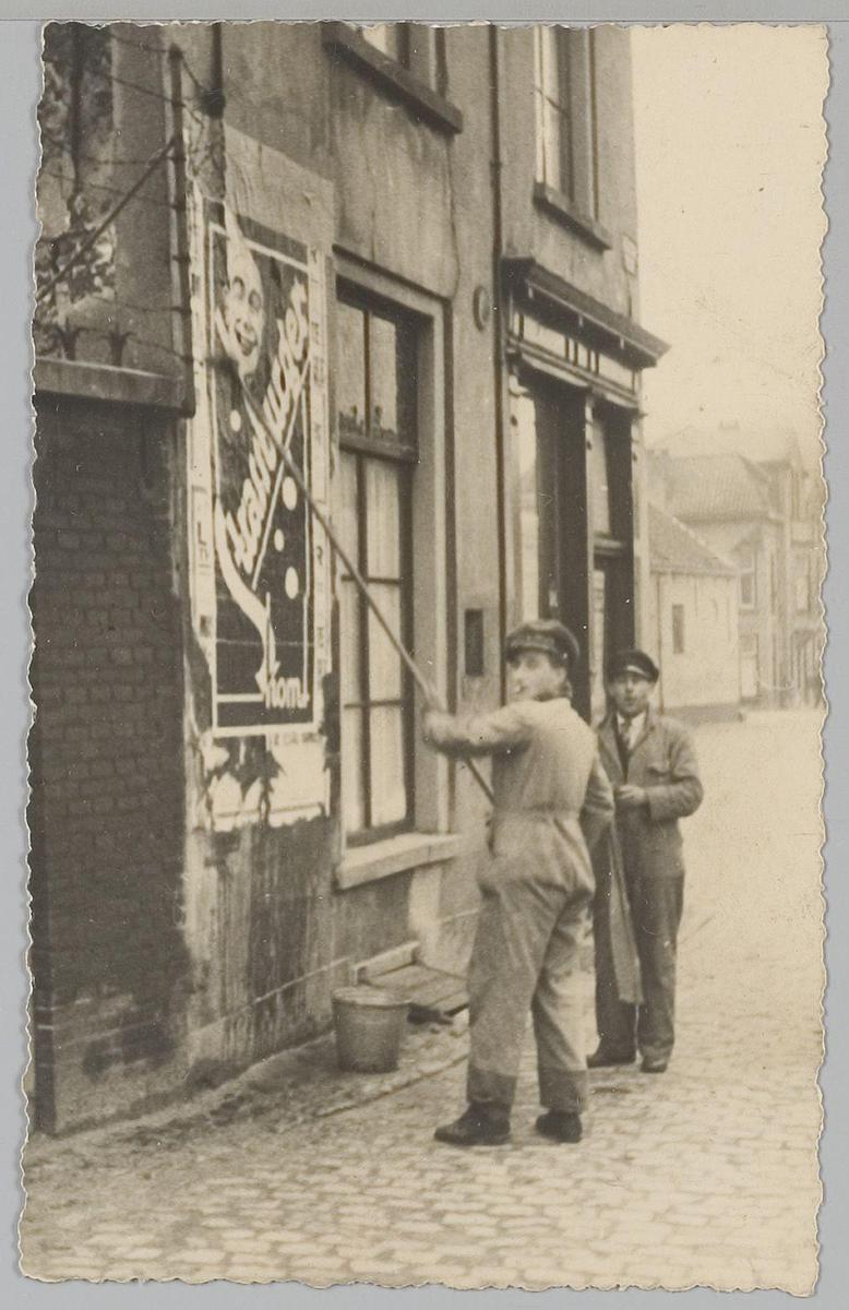 Het plakken van de affiches. 1936, Belgie. Rechts Wi...