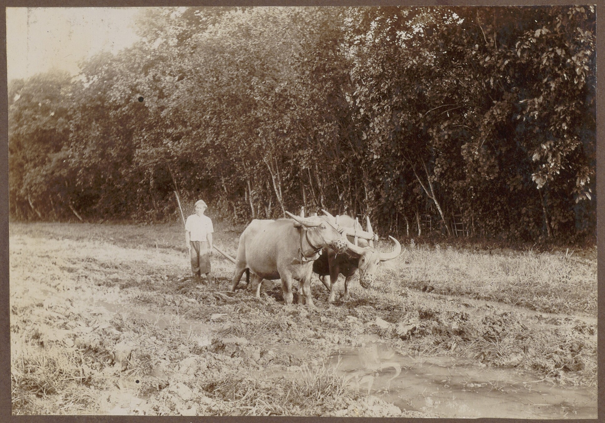 De Javaanse boer ploegt het rijstveld om met de hulp...
