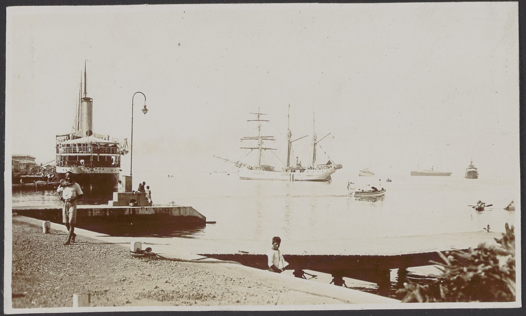 Uitzicht over de kade met de 'Batavia' afgemeerd en ...
