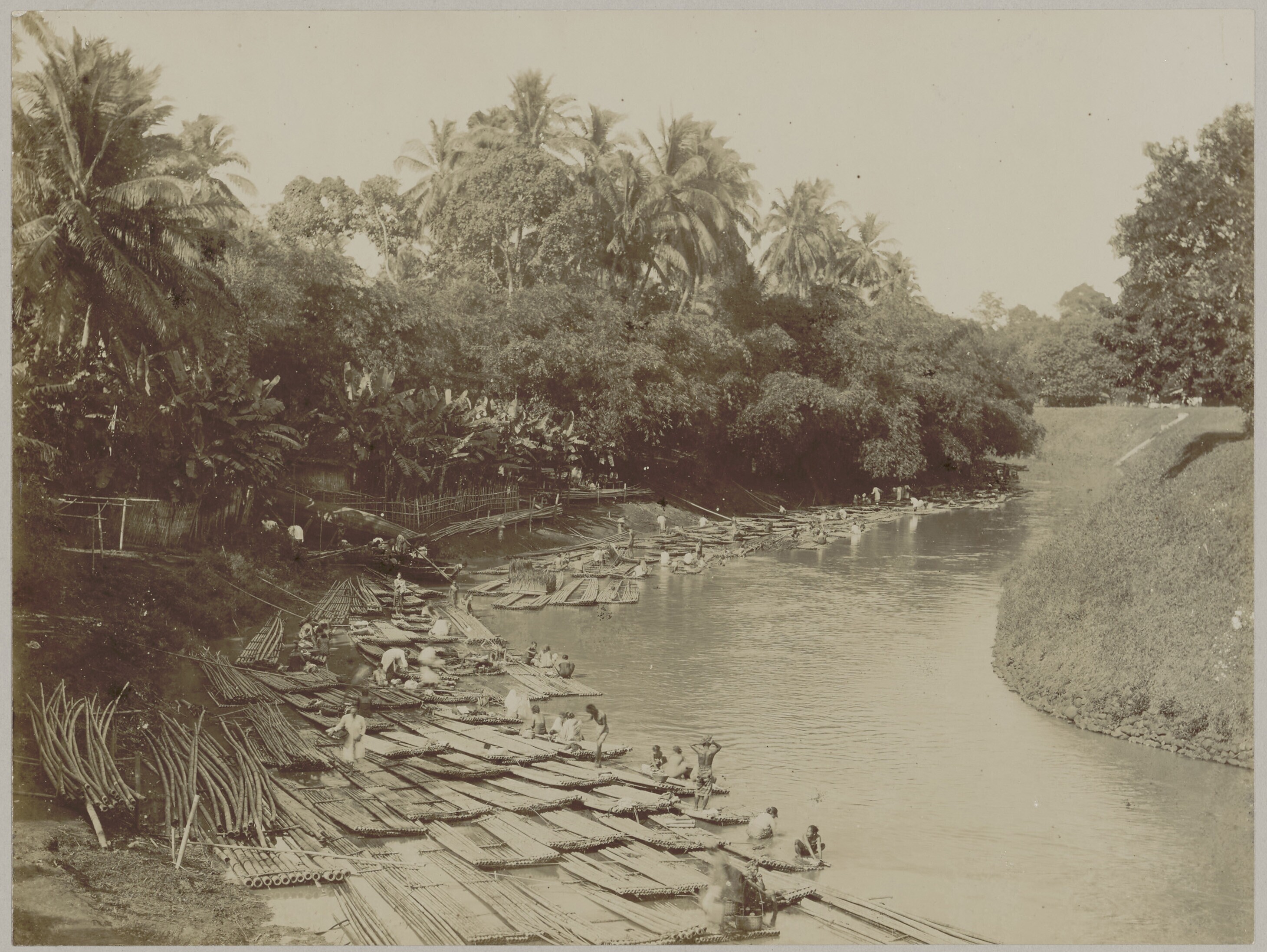 Het wassen van kleding op vlotten van bamboe in de r...