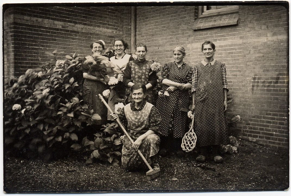 Zes schoonmaaksters van de kerk met schort en met be...