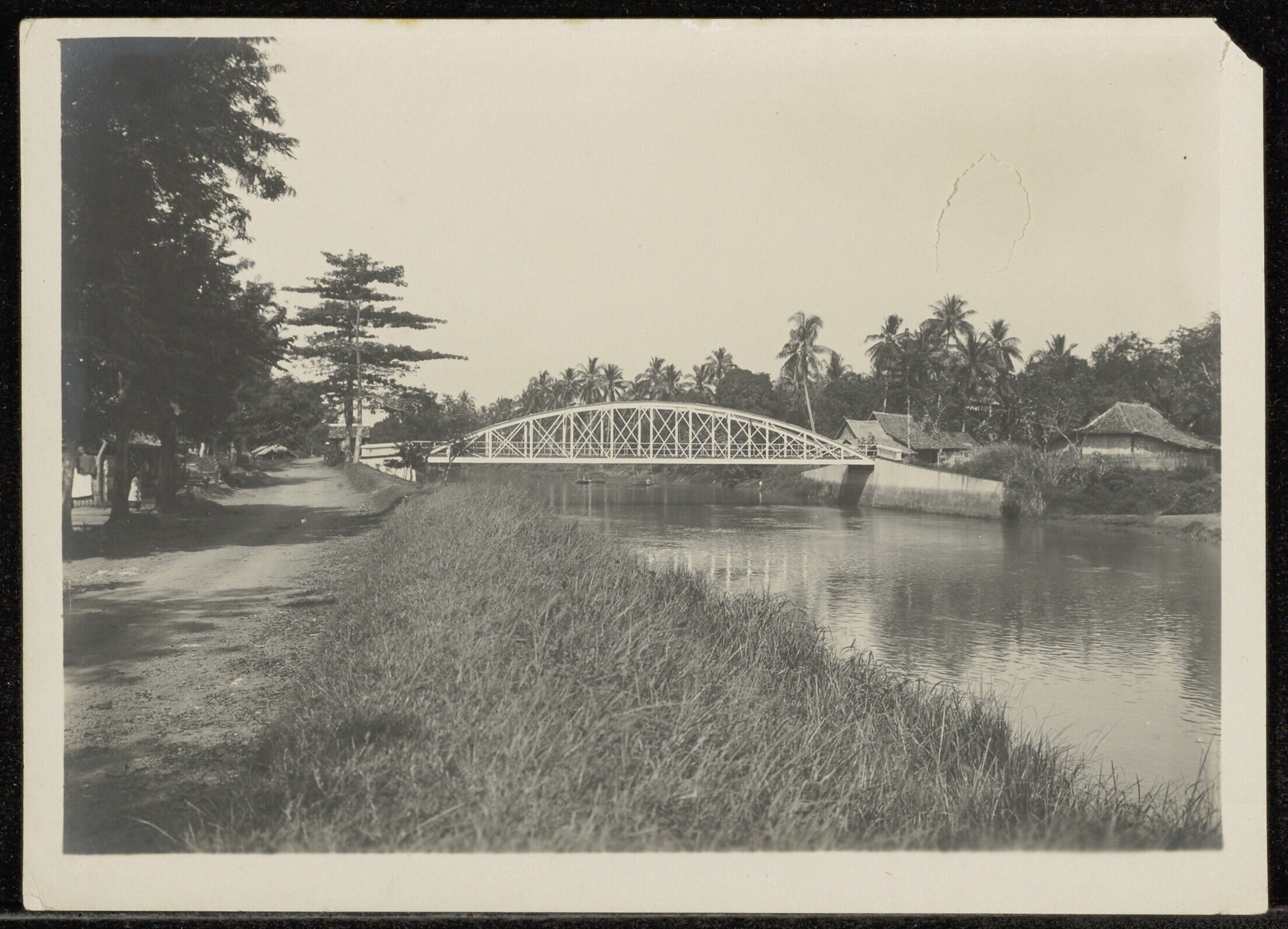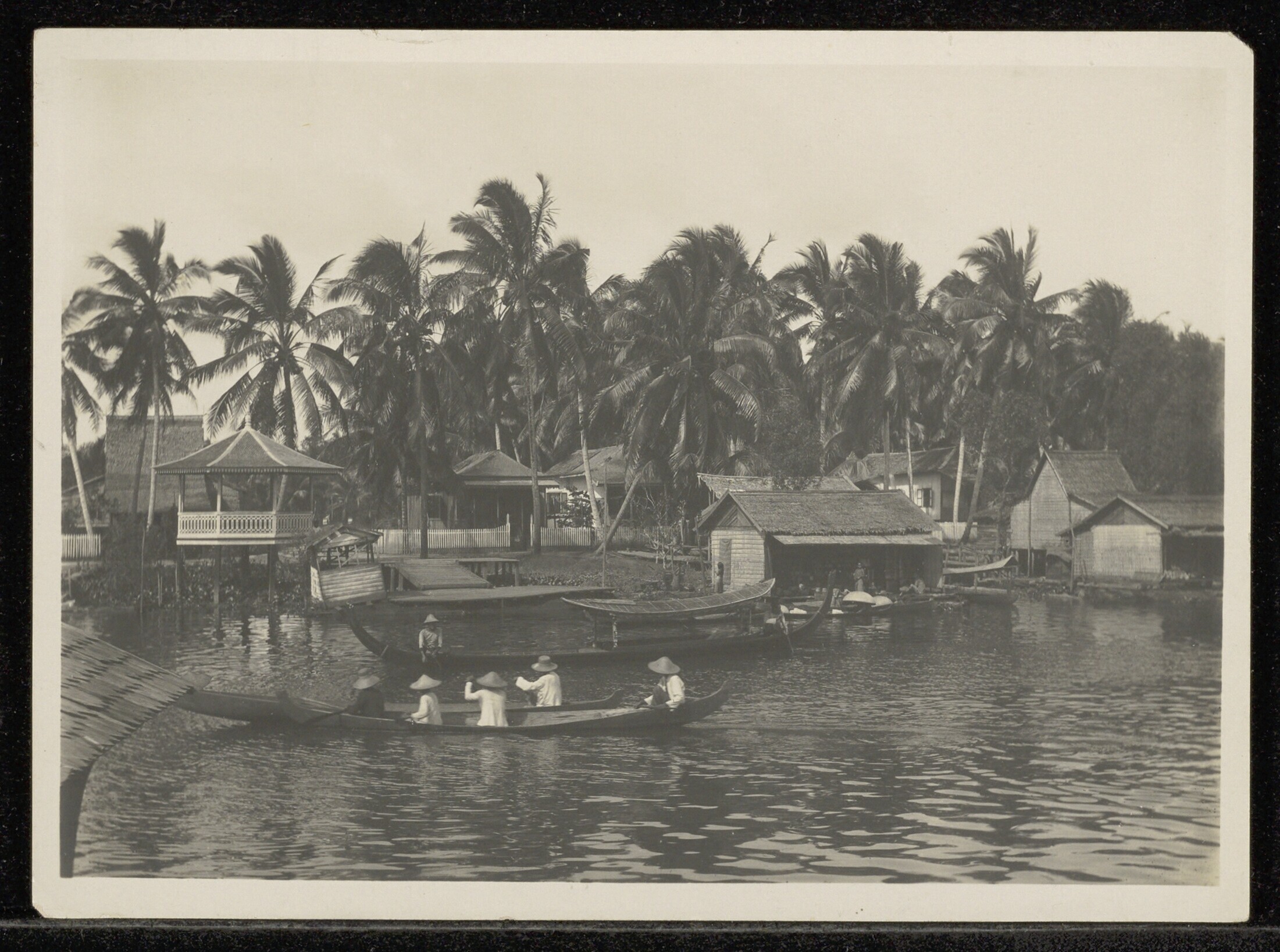 Riviergezicht met prauwen, een winkel en woonhuizen,...